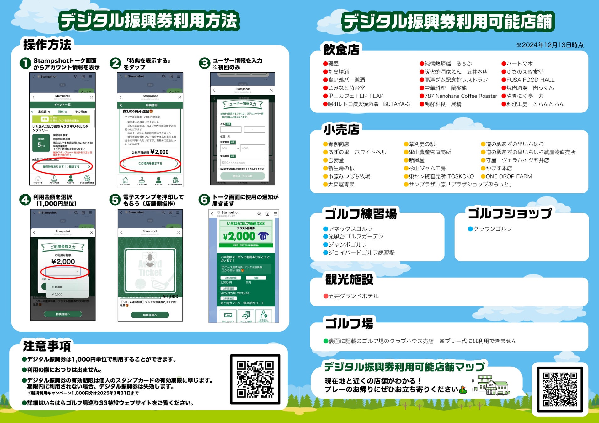 (※)市内登録店舗、「いちはらゴルフ場巡り33」対象ゴルフ場の売店で利用できる電子クーポンです。利用方法、登録店舗はリーフレットをご覧ください。
