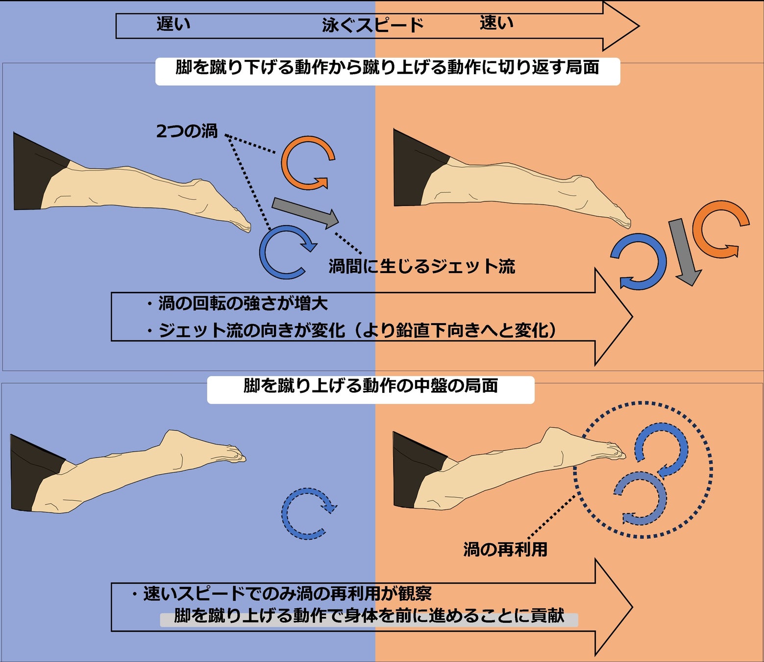 その結果、泳ぐスピードを上げると、足の周りに生成される渦の回転の強さが大きくなることが分かりました。また、脚を蹴り下ろす動作から蹴り上げる動作に移行する局面で観察された渦の構造に変化が見られ、泳ぐスピードの増大に伴って、足の周りに生成される2つの渦の間に生じるジェット流注1)の向きがより鉛直下向きへと変化しました。さらに、スピードを上げると、脚を蹴り上げる中盤の局面で、脚の周りに生成された渦を再利用することにより生成する、身体を前に進める方向への水の流れが観察されました。渦やジェット流は水の運動量の変化を反映しており、身体が水からどのような力を受けたかを理解するヒントになります。本研究で観察された渦構造の変化は、蹴り上げ動作で身体を前に進めることに貢献している可能性が示されました(参考図)。