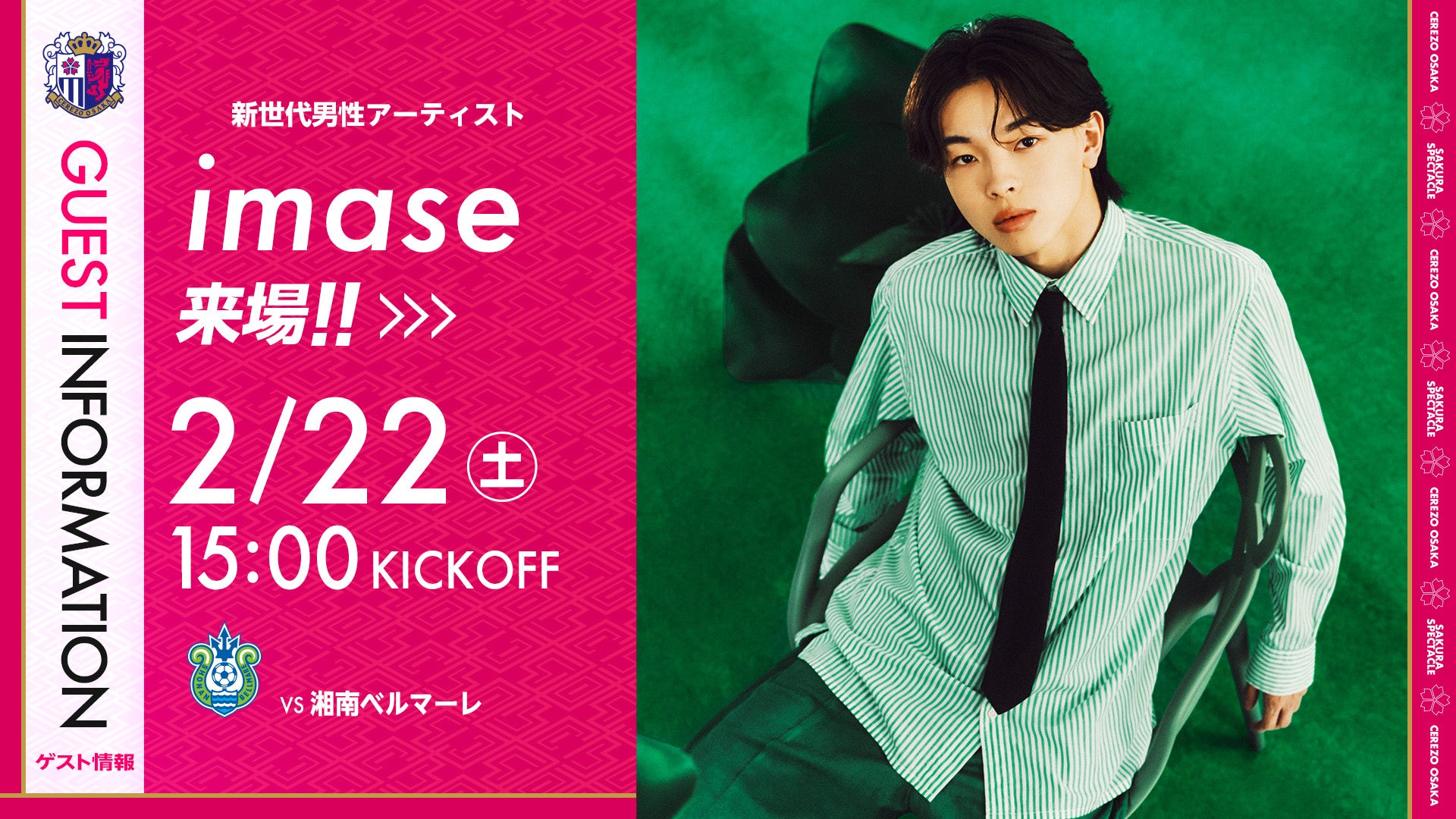 2月22日(土)明治安田J1リーグ第2節湘南ベルマーレ戦にimaseさんの来場が決定しましたのでお知らせします。imaseさんはご自身もサッカー経験者で、第103回全国高校サッカー選手権大会の応援歌を担当されるなどサッカーとの関わりも深く、ホーム開幕戦となる本試合にご来場いただく運びとなりました。