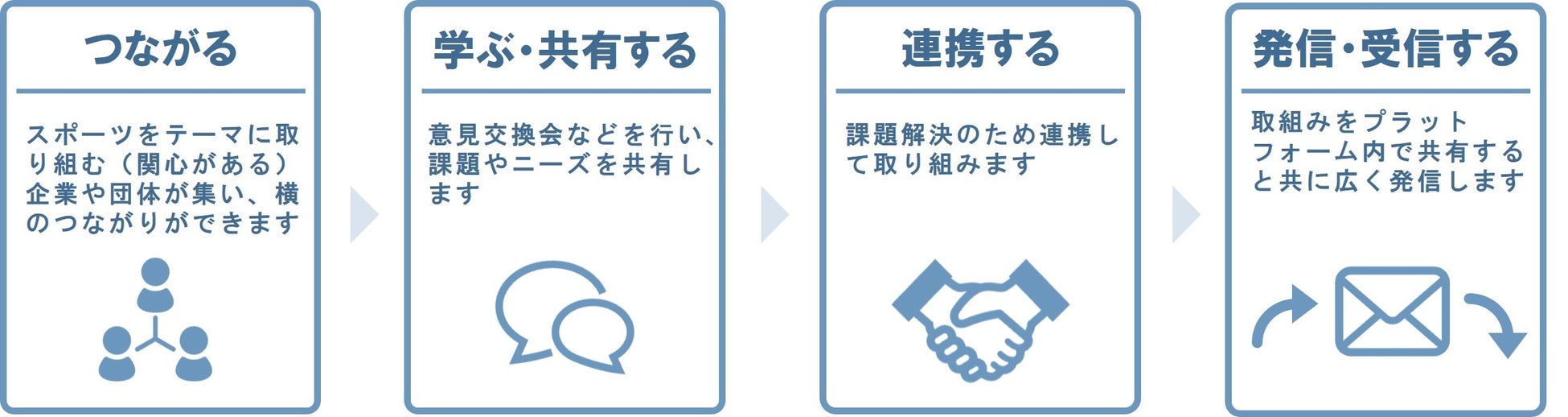 スポーツをテーマにした取り組みに関心がある企業や団体、自治体などがつながり、課題やニーズを共有、意見交換しながら、スポーツを通じた地域活性化や共生社会の実現など社会的な課題の解決をめざします。