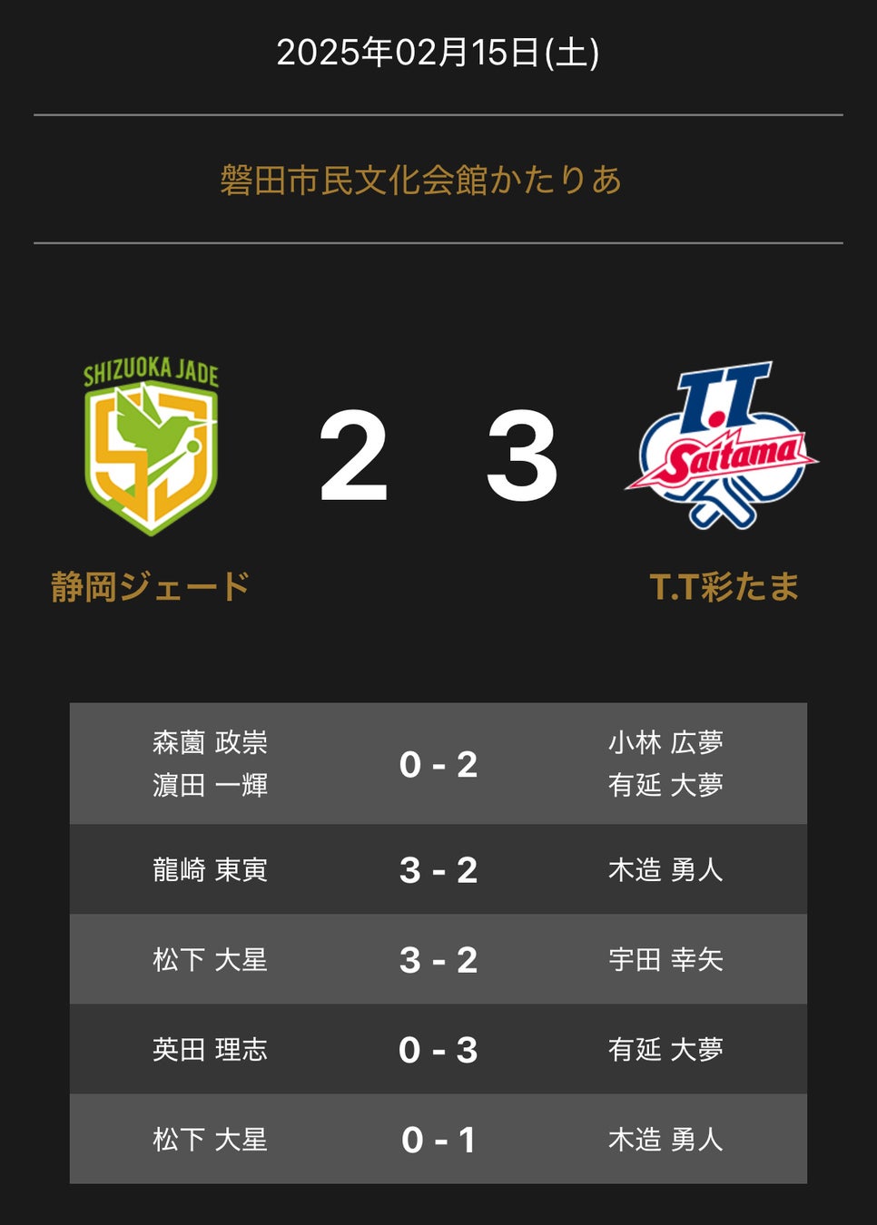 ノジマTリーグ 2024-2025シーズン 公式戦 2月15日開催 静岡ジェードvs T.T彩たまの試合は2-3でT.T彩たまが勝利しました。