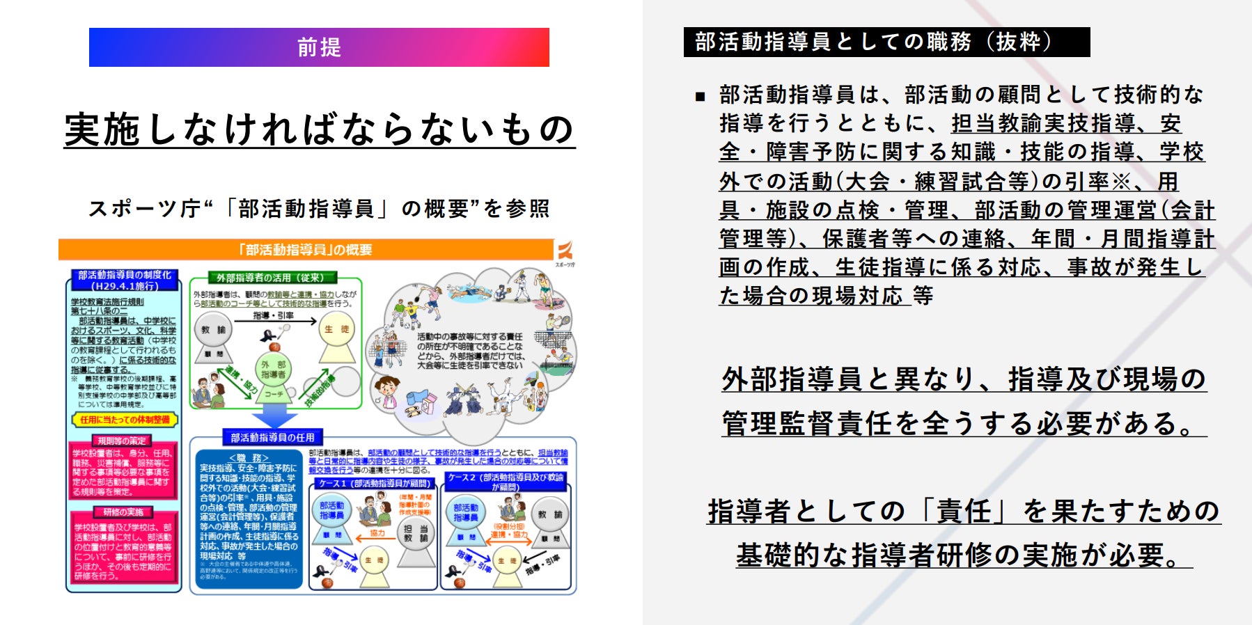 部活動指導員は、専門的な技術指導だけでなく、大会の引率や部活動の管理、生徒指導など多岐にわたる役割を担います。そのため、適切な研修を受けることが欠かせません。