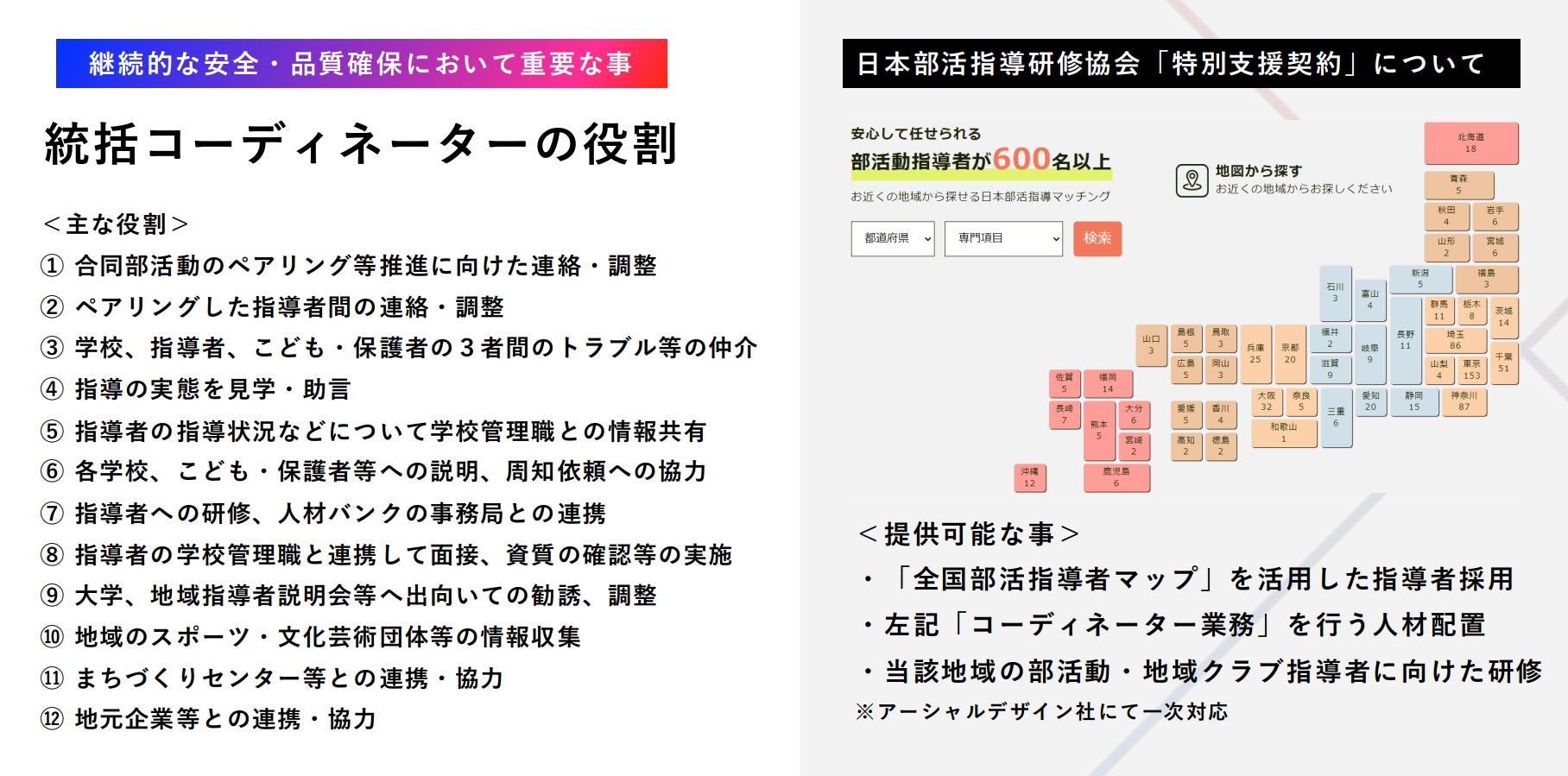 統括コーディネーターは、地域の部活動移行を支える中心的な役割を担い、(一社)日本部活指導研究協会では特別支援契約として以下のようなサポートを提供し、各自治体の部活動移行を支援しています。