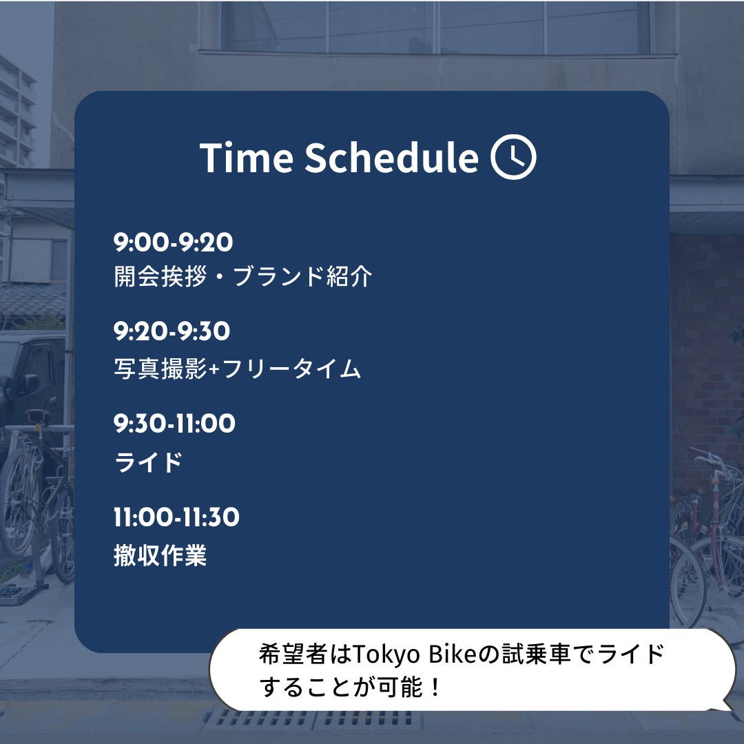 希望者にはTokyo Bikeの試乗車でサイクリングをお楽しみいただけます。台数に限りがございますのでお早めにお申し込みください。キッズバイクもご用意がございますのでご家族でもご参加いただけます。
