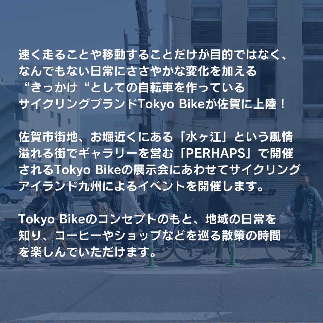 速く走ることや移動することが目的ではなく、日常にささやかな変化を加える“きっかけ”としてのサイクリングを提案する「Tokyo Bike」が佐賀に上陸!佐賀市街地の風情ある「水ヶ江」エリアで、ギャラリー「PERHAPS」にて開催されるTokyo Bike展示会と連携し、地域の日常を体感しながら楽しめるモーニング・サイクリングイベントを実施します。