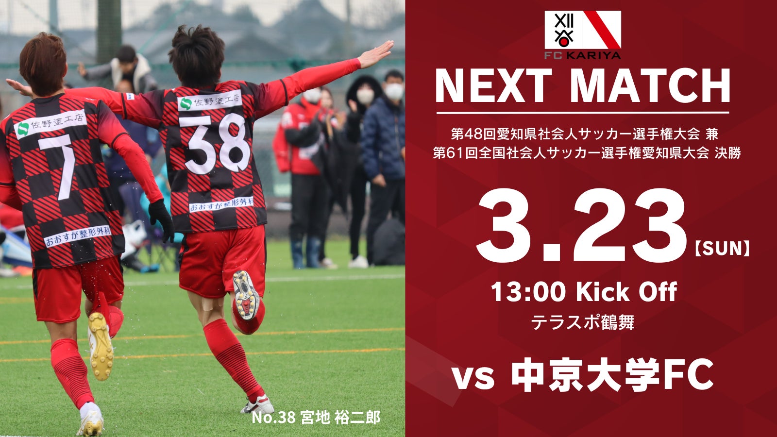 第48回愛知県社会人サッカー選手権大会 兼 第61回全国社会人サッカー選手権愛知県大会決勝 FC刈谷vs中京大学FCが今週末3/23(日)テラスポ鶴舞にて13:00kick offで行われる。