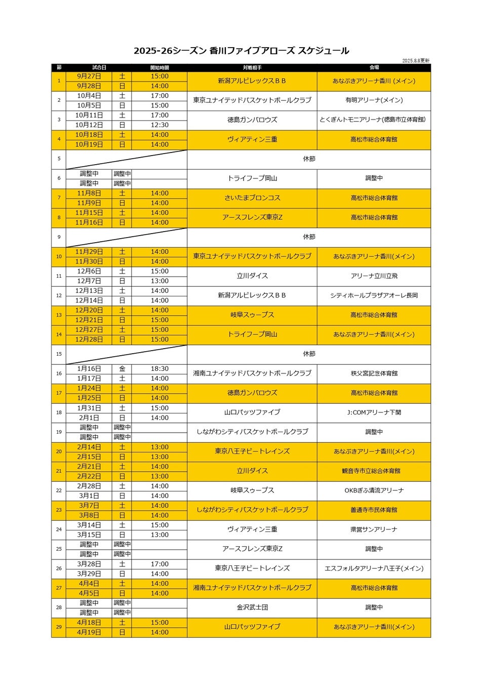 いつも香川ファイブアローズを応援していただき、誠にありがとうございます。このたび、2025-26シーズンの試合開始時間が決定しましたので、お知らせいたします。