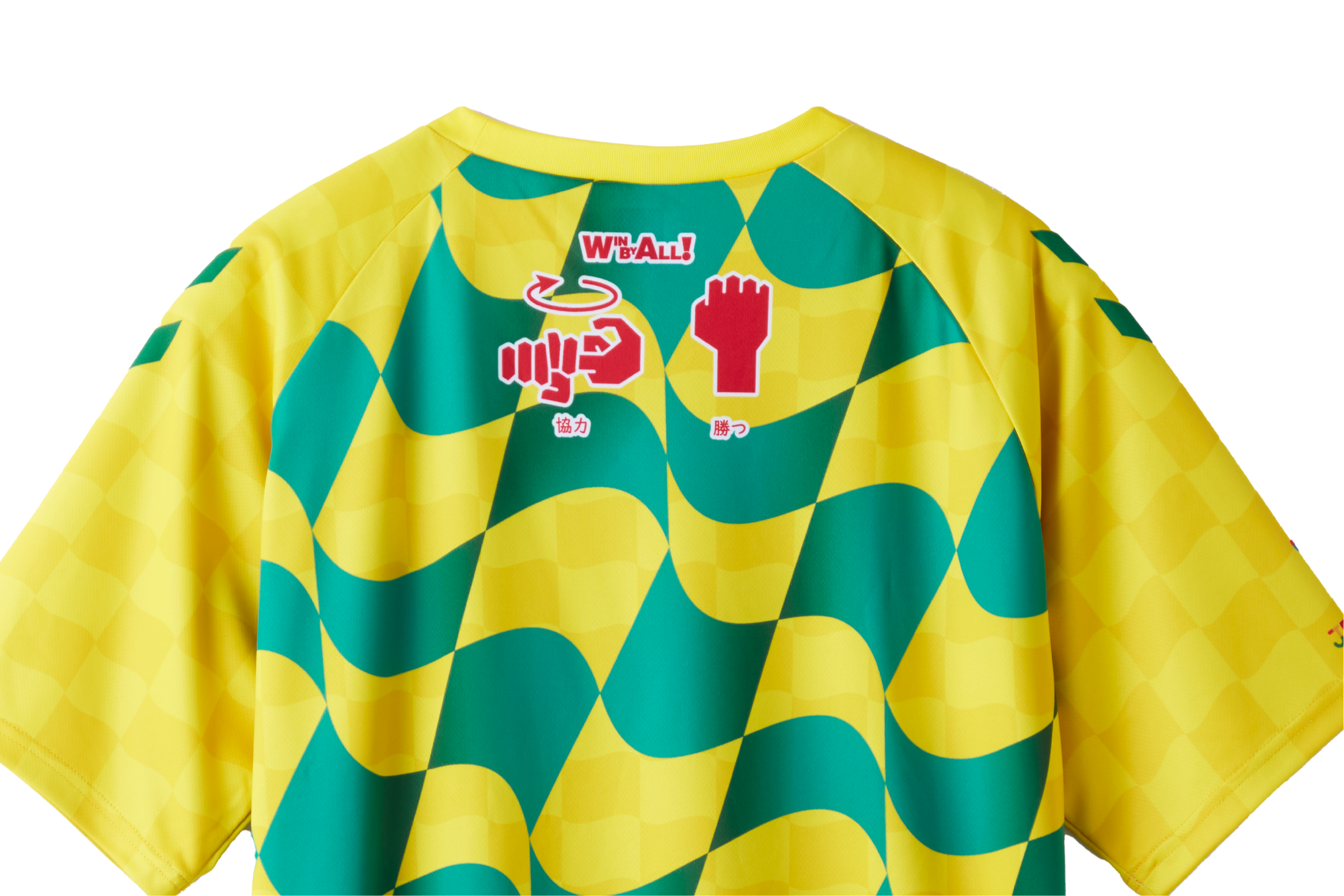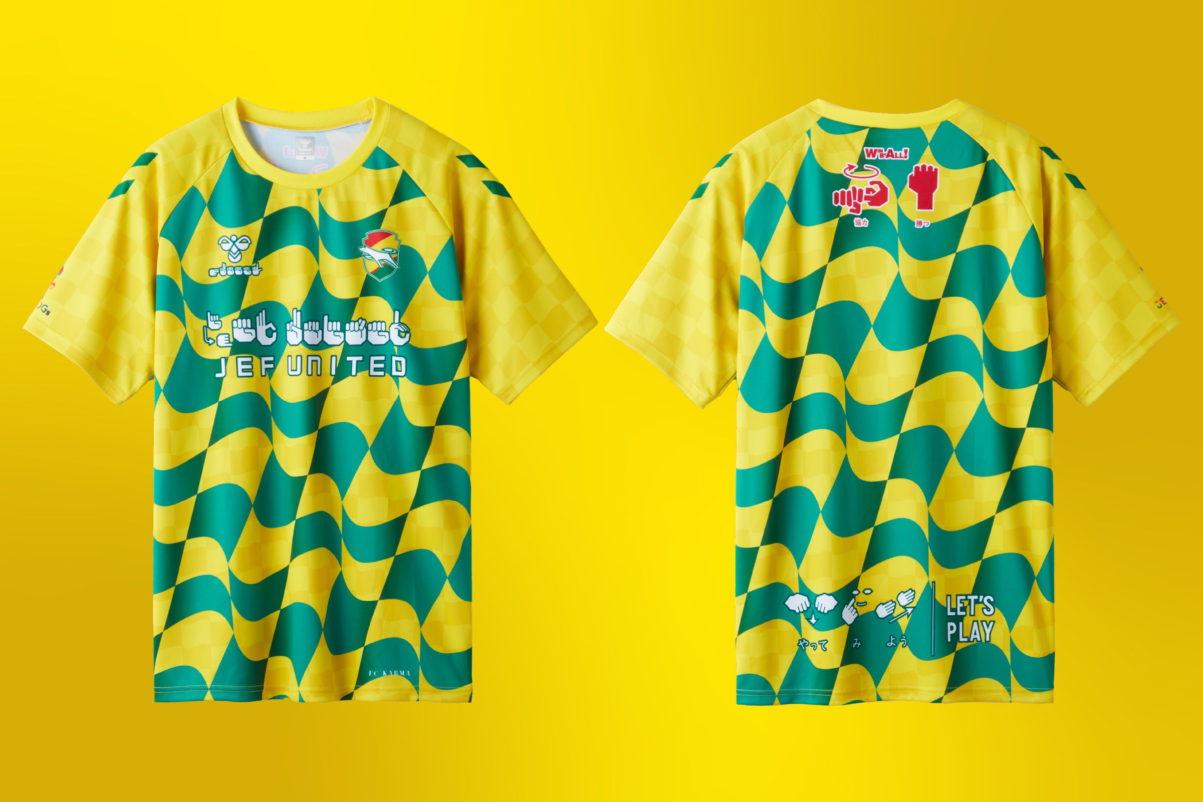 今回、選手たちが着用したシャツは、フラッグを重ね合わせたデザインに手話のイラストを配置したもの。「心の旗を振ろう」をテーマに、表面にJEFUNITEDを指文字とアルファベットで表記。背面上部にはクラブフィロソフィー「WIN BY ALL!」を入れ、「協力」と「勝つ」を対応する手話として取り入れたチャリティーTシャツです。