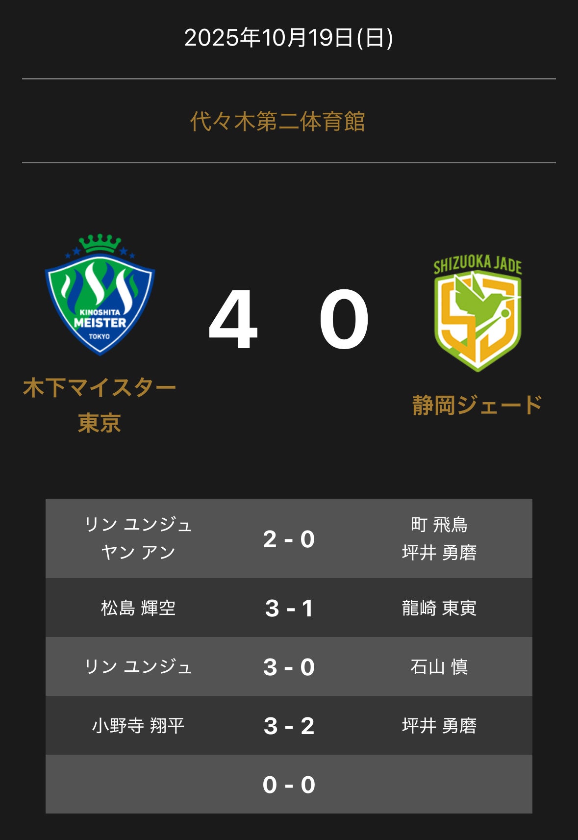 ノジマTリーグ 2025-2026シーズン 公式戦 10月19日開催 木下マイスター東京 vs 静岡ジェードの試合は、4-0で木下マイスター東京が勝利しました。