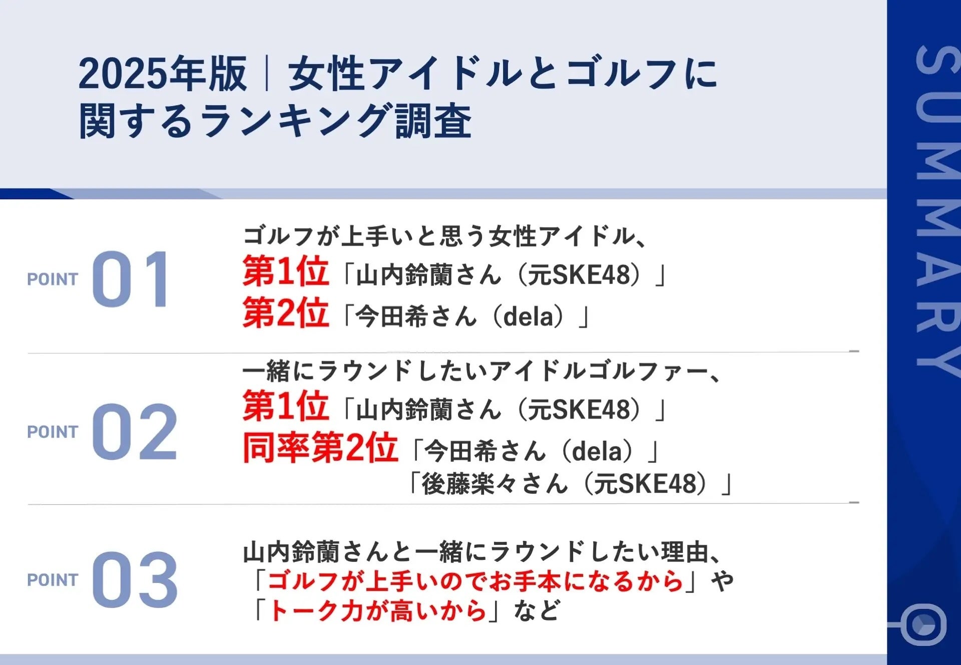5年目となる、「2025年版|女性アイドルとゴルフに関するランキング調査」。最もゴルフが上手いと思う女性アイドルには、「山内鈴蘭さん(元SKE48)」が32.0%で第1位となりました。一緒にラウンドしたいアイドルゴルファーについても、「山内鈴蘭さん(元SKE48)」が29.7%でトップを獲得し、「スイングが豪快」や「昔からゴルフに親しんでいる印象」「元気がもらえそう」などの声が寄せられています。両ランキングにおいて「山内鈴蘭さん」が1位を獲得したことから、男性ゴルファーにとって山内鈴蘭さんは技術面での信頼性と一緒にプレーしたいという魅力を兼ね備えた存在として高く評価されていることが明らかになりました。