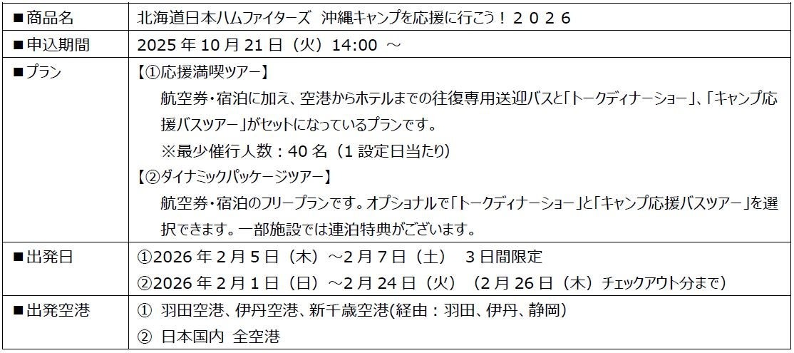ANA X株式会社(代表取締役社長:神田 真也、本社:東京都中央区、以下「ANA X」)は、10月21日(火)14:00より国内ツアー「北海道日本ハムファイターズ 沖縄キャンプを応援しよう!2026」を発売します。