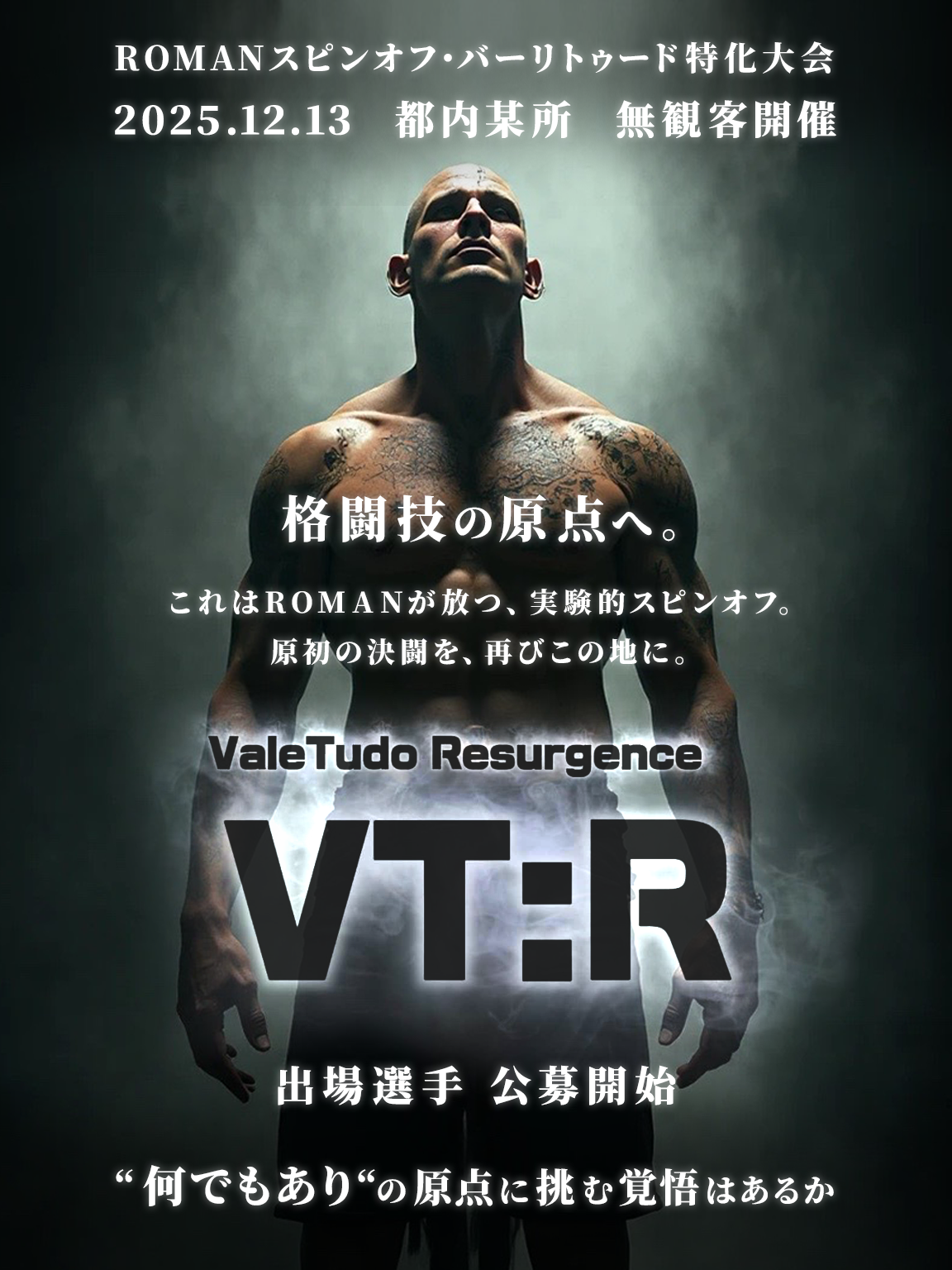 道着MMAやROMAN柔術を通じて“格闘技の原点”を追求してきたROMAN株式会社(本社:神奈川県鎌倉市、代表取締役CEO:渡辺直由)は、バーリトゥードマッチに特化した 「VT:R ZERO(Vale Tudo Resurgence ZERO)」 を2025年12月13日(土)に開催することを決定しました。