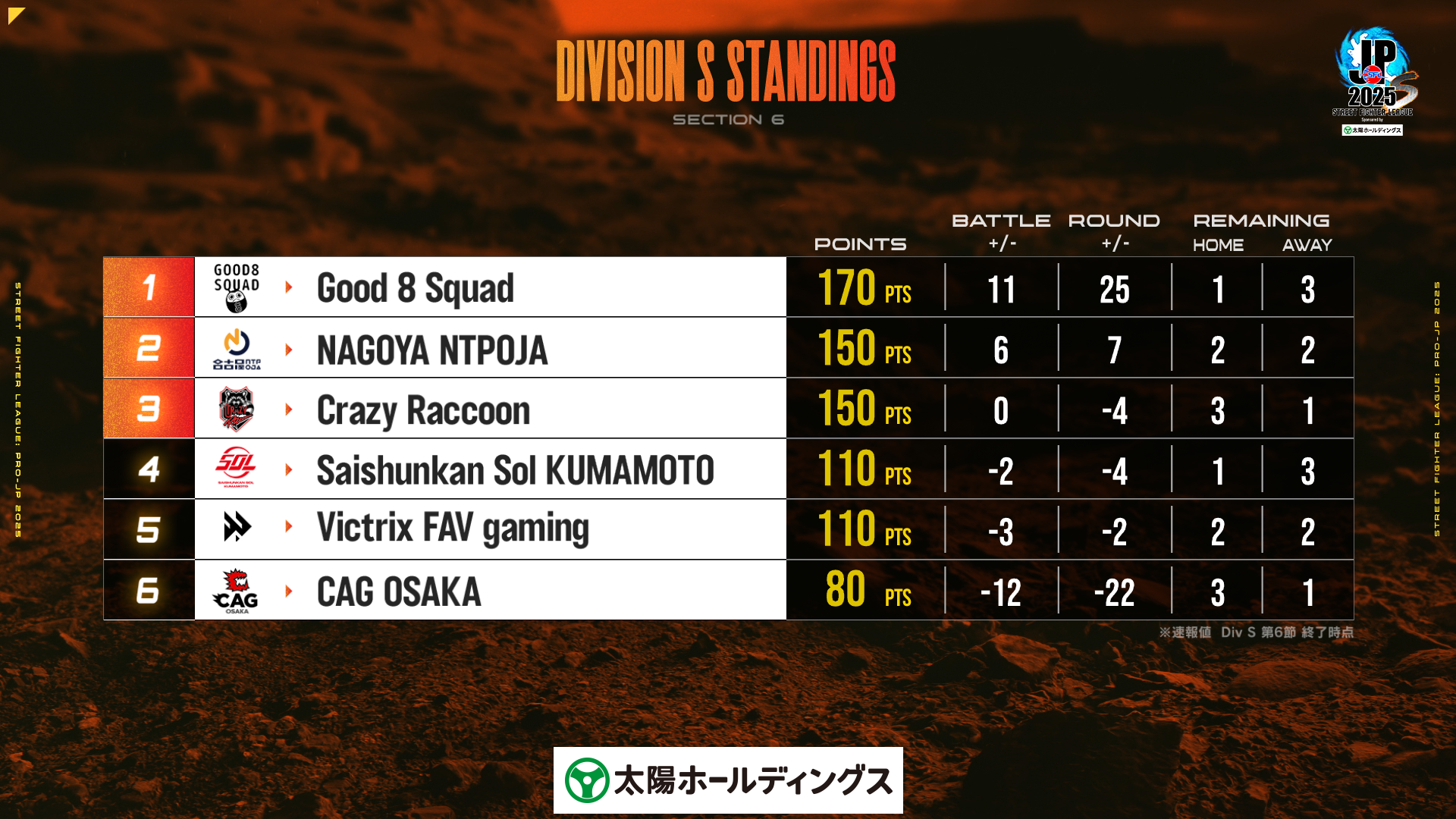 Division S 順位表 ※第6節終了時点