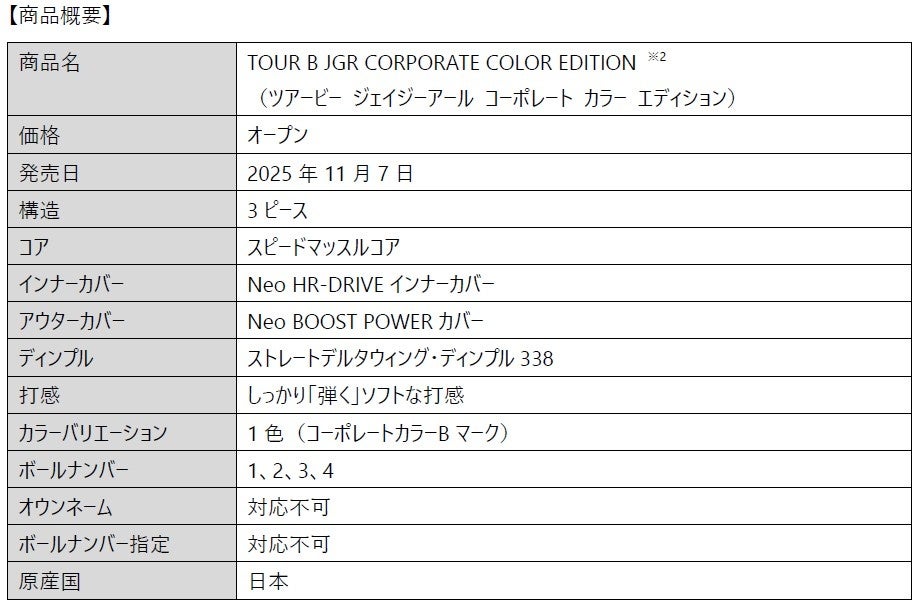同商品は、当社契約プロが使用するツアーモデル『TOUR B X/XS』※1のカラーバリエーションの中でも人気の高い、コーポレート「Bマーク」を採用しています。当社のホワイト(白)のボールを使用するゴルファーの中で、ロゴのカラーで同伴者と区別がしやすいと好評のデザインです。タイヤやモータースポーツでもお馴染みの「Bマーク」が入った新しいデザインの『TOUR B JGR』でメガ飛びをご体感ください。