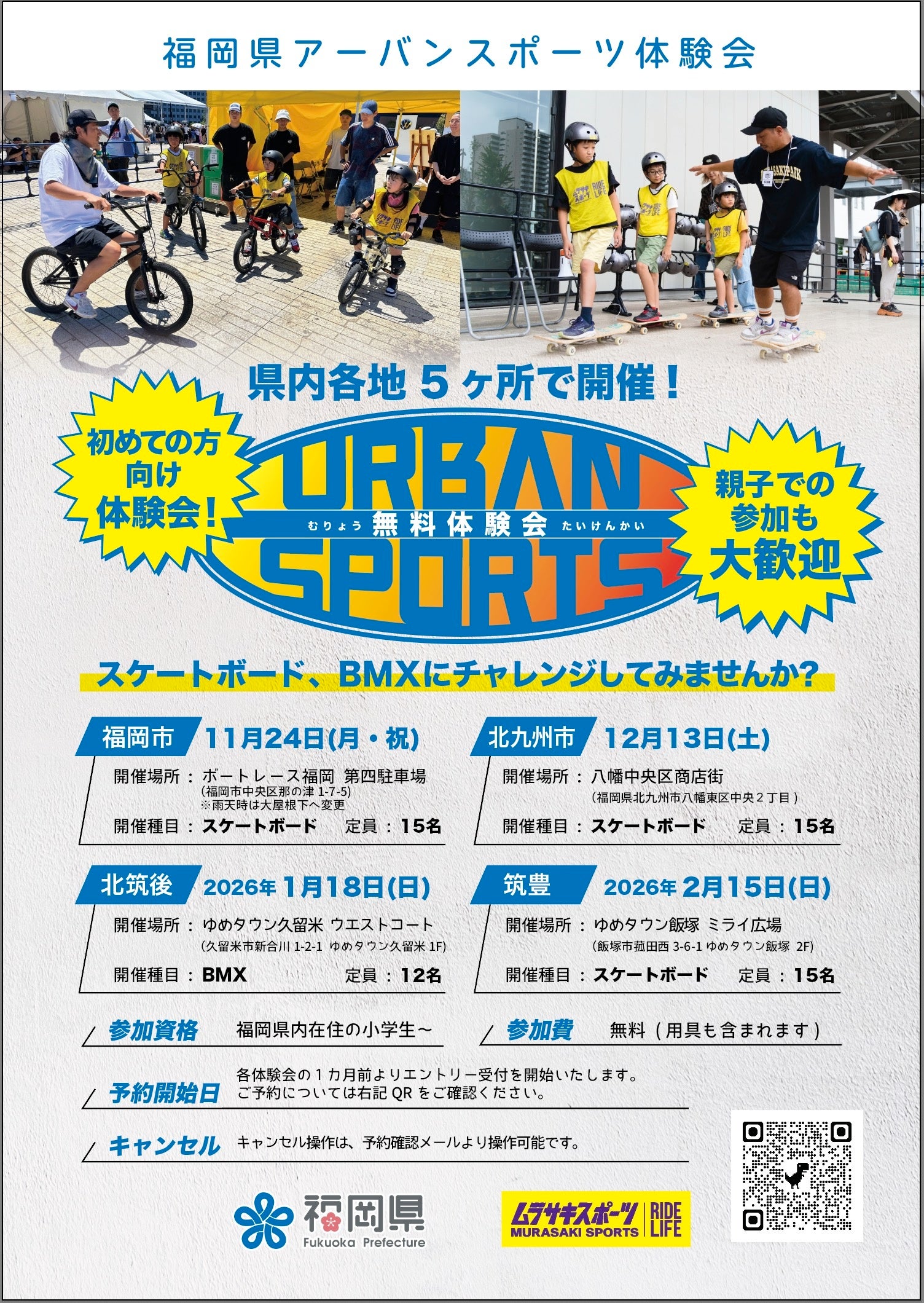 株式会社ムラサキスポーツ(本社:東京都台東区、取締役社長:金山 洋一)は、9月より開催される福岡県主催のアーバンスポーツ体験会(スケートボード、BMX)の運営を行うことをお知らせいたします。本イベントは、スケートボード、BMXなど、東京オリンピックでも話題となった競技を無料で体験できる貴重な機会となっており、福岡県内各所にて、月1回のペースで全5回実施いたします。