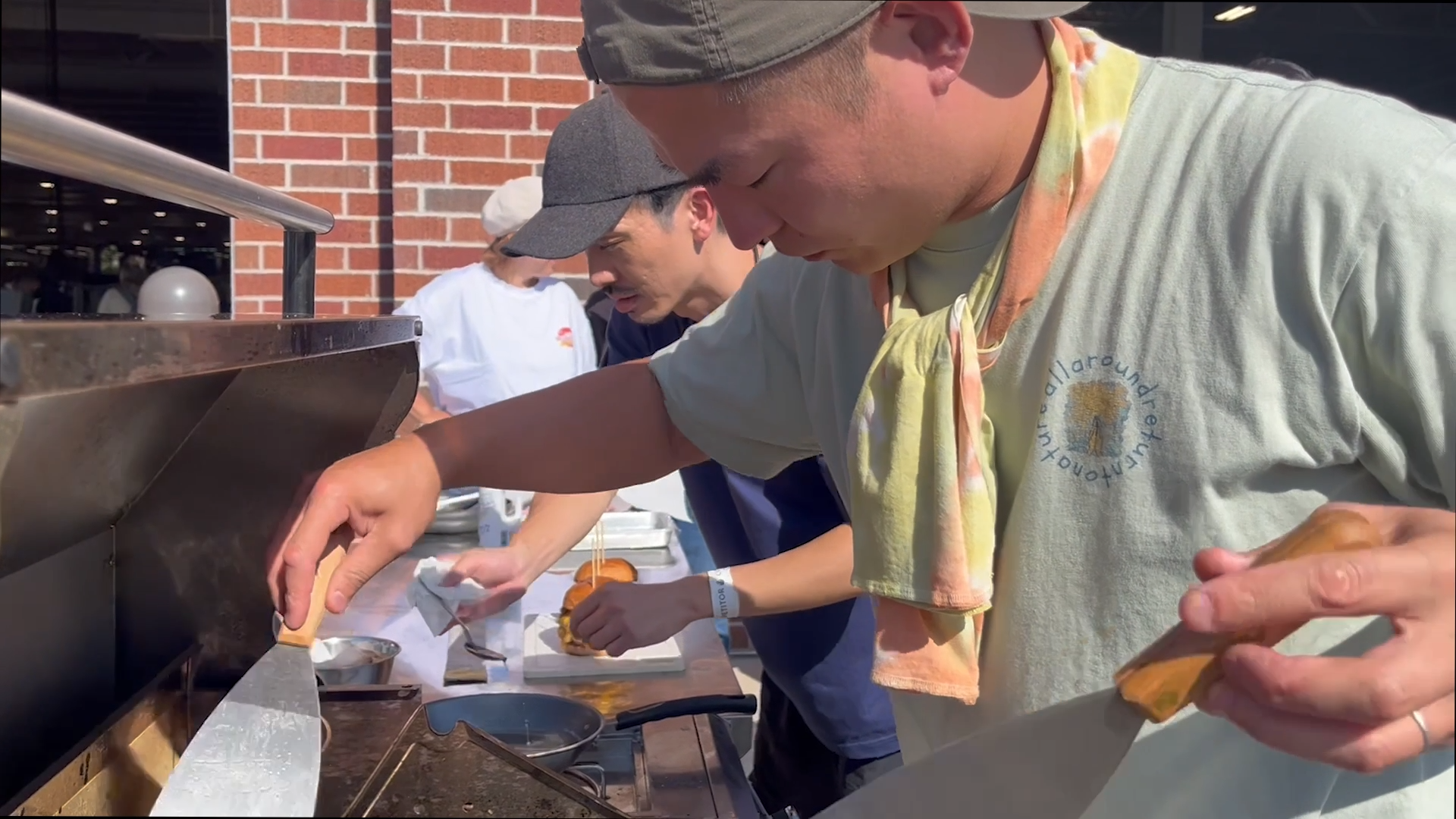佐藤シェフは、揚げ春雨や9種のスパイス、3種の肉を組み合わせた個性豊かなバーガーで挑戦。