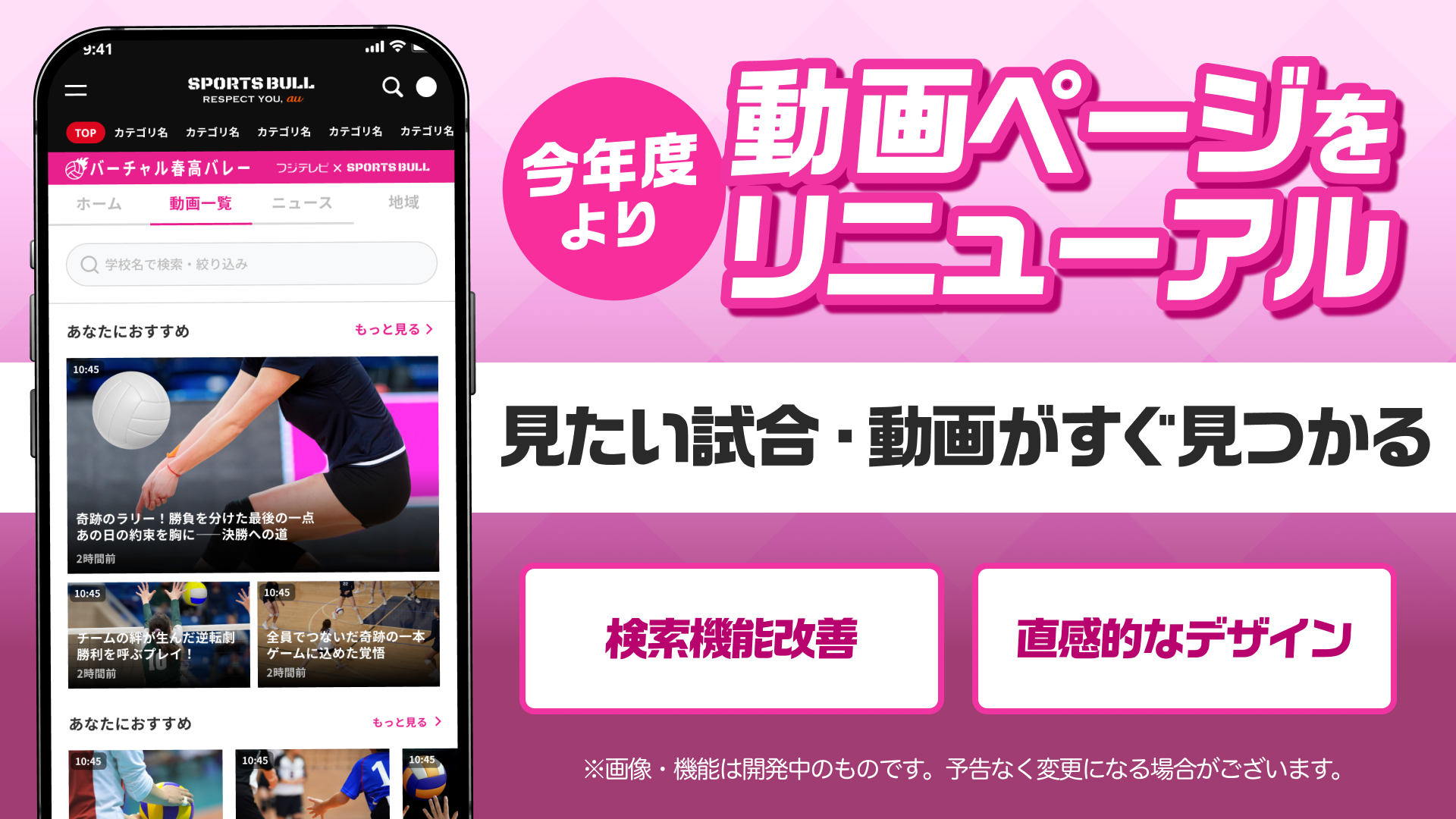 今年度から動画ページをリニューアルします。「見たい試合・動画がすぐ見つかる」をテーマに、機能とデザインの両面で刷新。キーワードやカテゴリ検索がよりスムーズになり、「新着動画」や「見逃し動画」など、多様な切り口から動画を探すことができます。ユーザーが求める試合や選手の動画へ、これまで以上に直感的にアクセスできます。