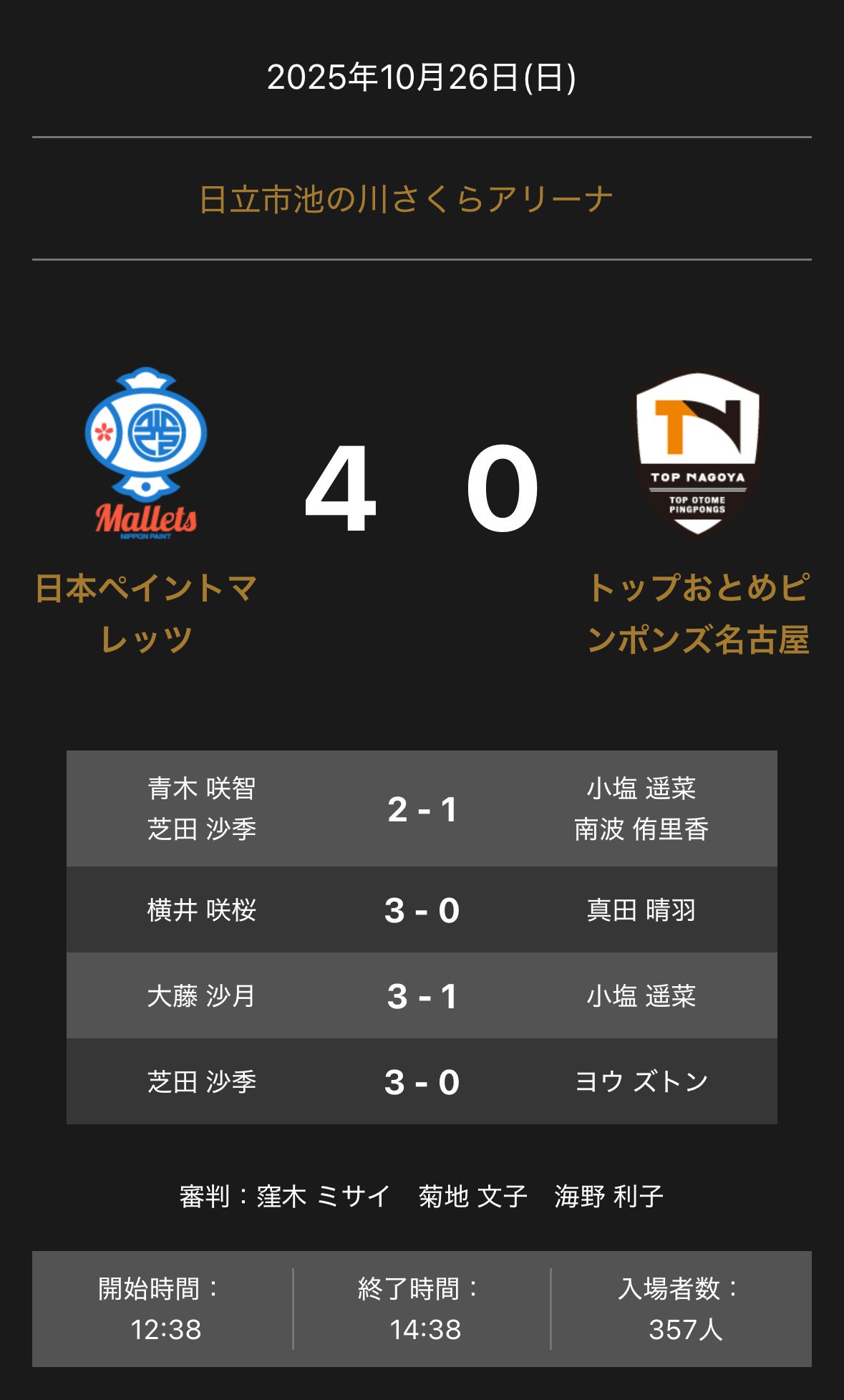 ホームプレスリリース ノジマTリーグ 2025-2026 公式戦 10月26日開催 日本ペイントマレッツ vs トップおとめピンポンズ名古屋 試合結果 2025年10月26日 15時30分 公開|スポーツマニア編集部プレスリリース 一般社団法人Tリーグのプレスリリース 日本ペイントマレッツとトップおとめピンポンズ名古屋の試合は、4-0で日本ペイントマレッツが勝利しました。