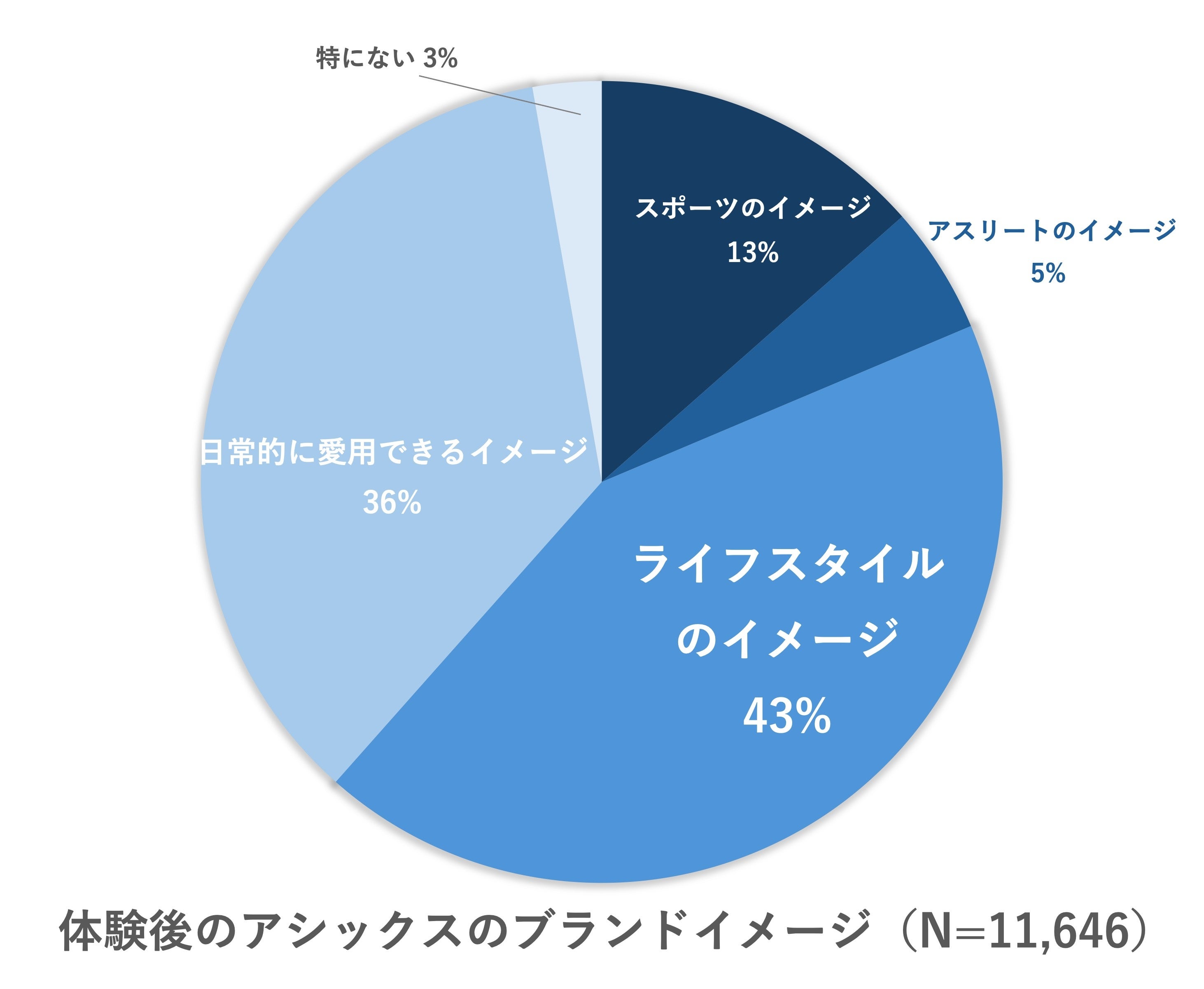 また、アシックスのブランドイメージについても、DISCOVER. by ASICSの体験前は「スポーツのイメージ」が半数でしたが、体験後は「ライフスタイルのイメージ」「日常的に愛用できるイメージ」が8割を占める結果となり、スポーツを積極的にされていない方も親近感を持ってもらえる機会になりました。