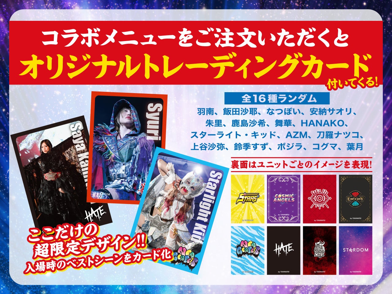 また、オリジナルメニュー1品につき『スターダム店限定オリジナルトレーディングカード』(16種ランダム)1枚をお渡しします。