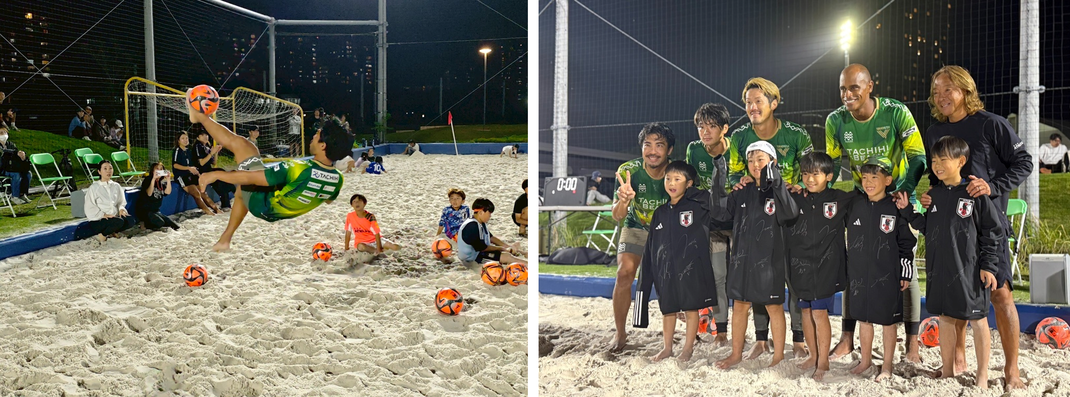日本サッカー協会の今井さんによるビーチサッカーコンテンツはとても大盛り上がり。サッカーゴルフやコーン当ては通常の芝生の上だと簡単でも、砂の深さが50cmもあるビーチサッカーコートだと急に難易度が上がります。参加者たちは砂のデコボコや沈む砂に苦戦しながら楽しんでポイントを競っていました。イベントの最後はエキシビションマッチとして北澤さん、茂怜羅選手、上里選手、大場選手、田中選手の5名によるドリームチームと各チームが対戦。日本代表経験選手たちの技術力に完敗し、各チームがなかなか点数が入れられない中、参加した小学生全員による連合チームが点数を入れると大歓声が上がっていました。