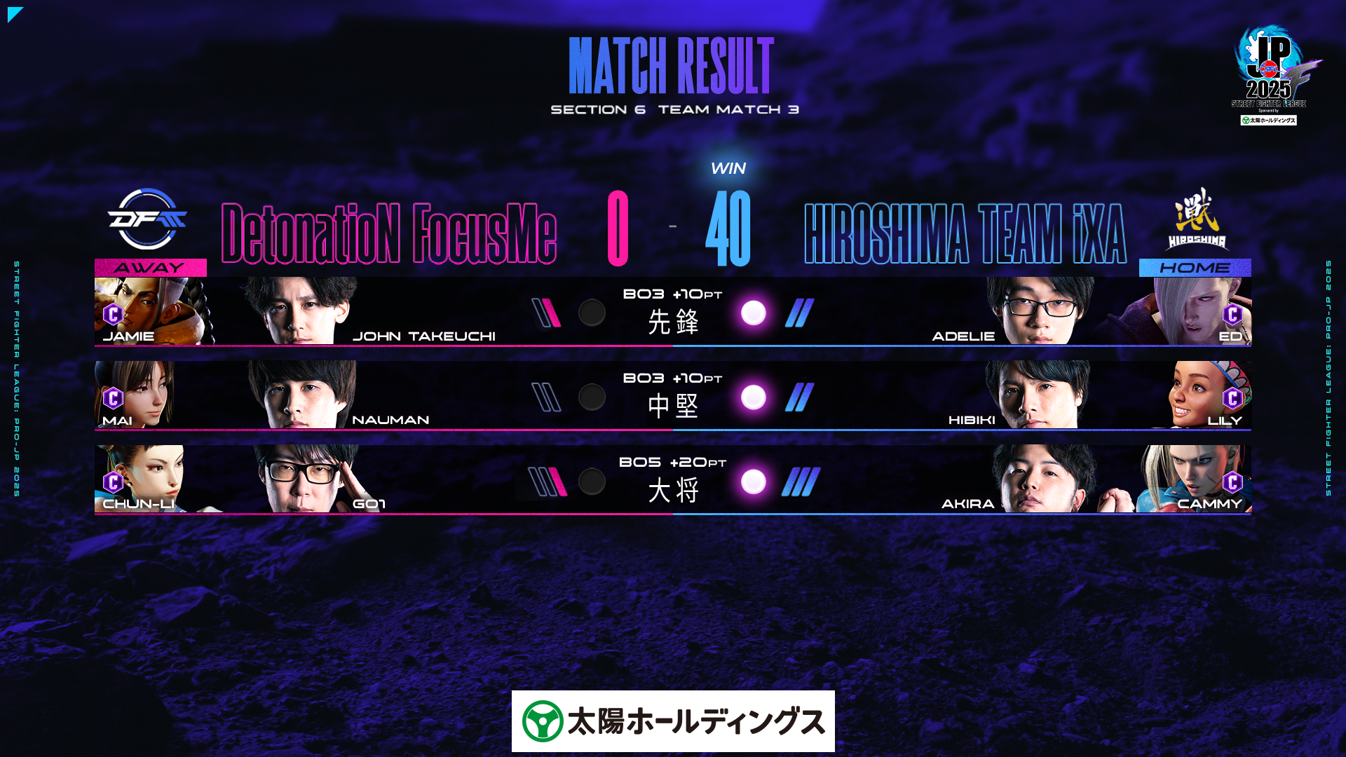 「0-40」で「広島 TEAM iXA」が勝利しポイントランキングも首位を維持。次節からのAWAY3連戦でのパフォーマンスにも注目したい。