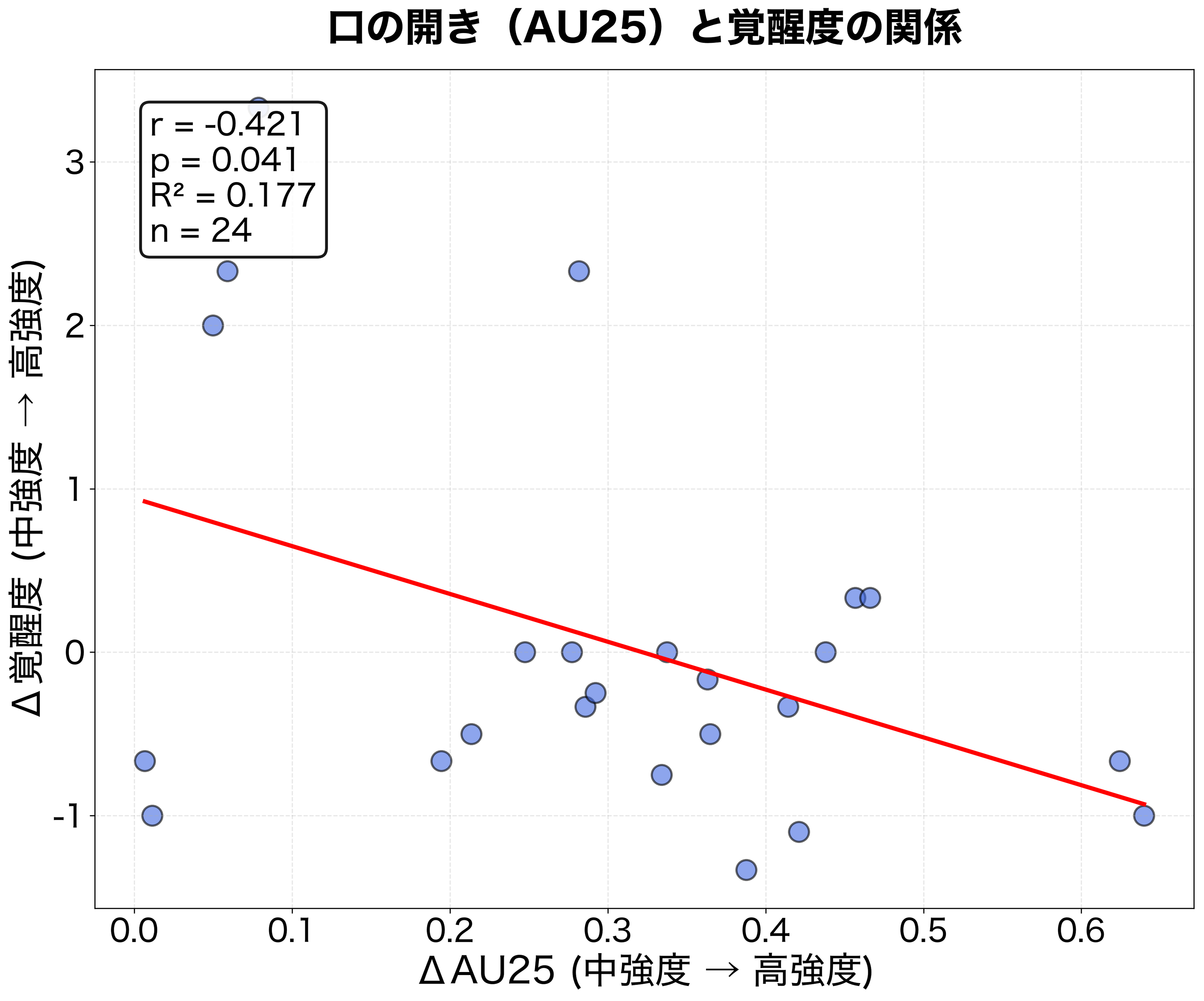 特に重要な発見として、運動の強さが中強度から高強度運動へ変わるときに、AU25(唇の動き)の変化量が、集中力や注意力の低下と有意に関係していることが分かりました (r = -0.421、P < 0.05; 図2)。