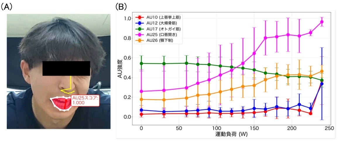 本研究は、健康な男子大学生25名を対象に、サイクルエルゴメーターを用いた運動テストを実施しました。運動中の顔の表情をビデオカメラで記録し、Py-Featを用いて16種類のAus(表情の動き)を解析しました (図1A)。同時に、心拍数、血中乳酸濃度、主観的運動強度 (rate of perceived exertion: RPE)、二次元気分尺度 (Two-Dimensional Mood Scale: TDMS) による覚醒度を測定しました。その結果、AU10 (上唇挙上)、AU17 (あご挙上)、AU25 (唇の開き)、AU26 (あご下げ) が運動強度や心拍数、血中乳酸濃度、RPE(運動のきつさ)と関連していることが分かりました (r = 0.314-0.631、全てP < 0.05; 図1B)。