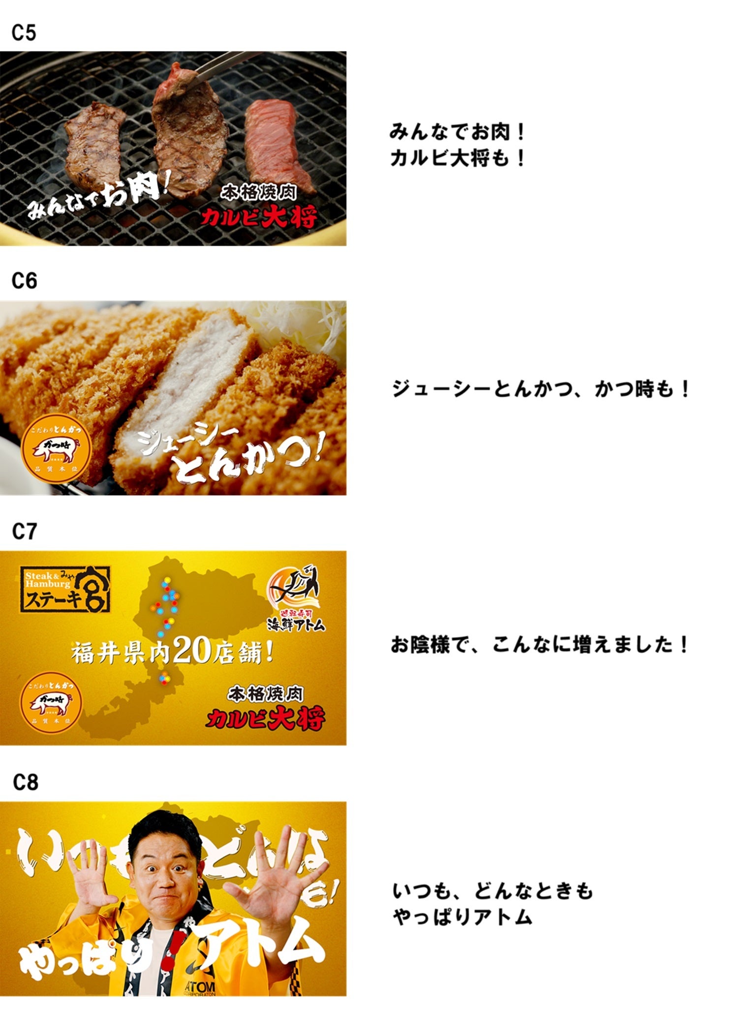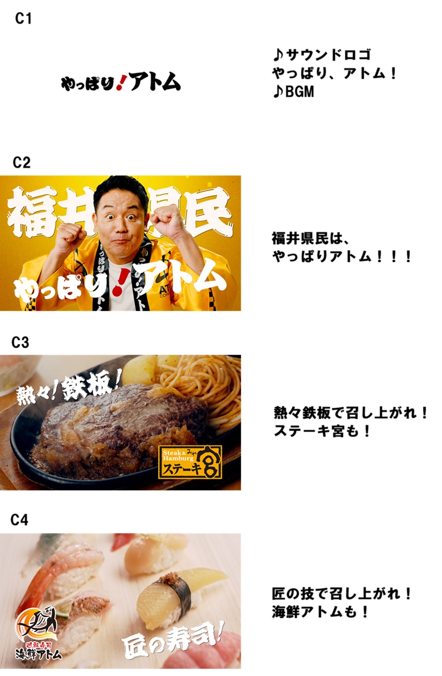お客様には日頃、家族の誕生日や仲間との懇親会、仕事終わりの社会人の方など様々なシーンで、アトムが運営する店舗にお越しいただいております。グループ紹介編では、「やっぱり、アトム!」を合言葉にし、桑原さんにステーキ宮と海鮮アトム、カルビ大将、かつ時がいつも、どんな時も身近にあることを紹介していただきました。
