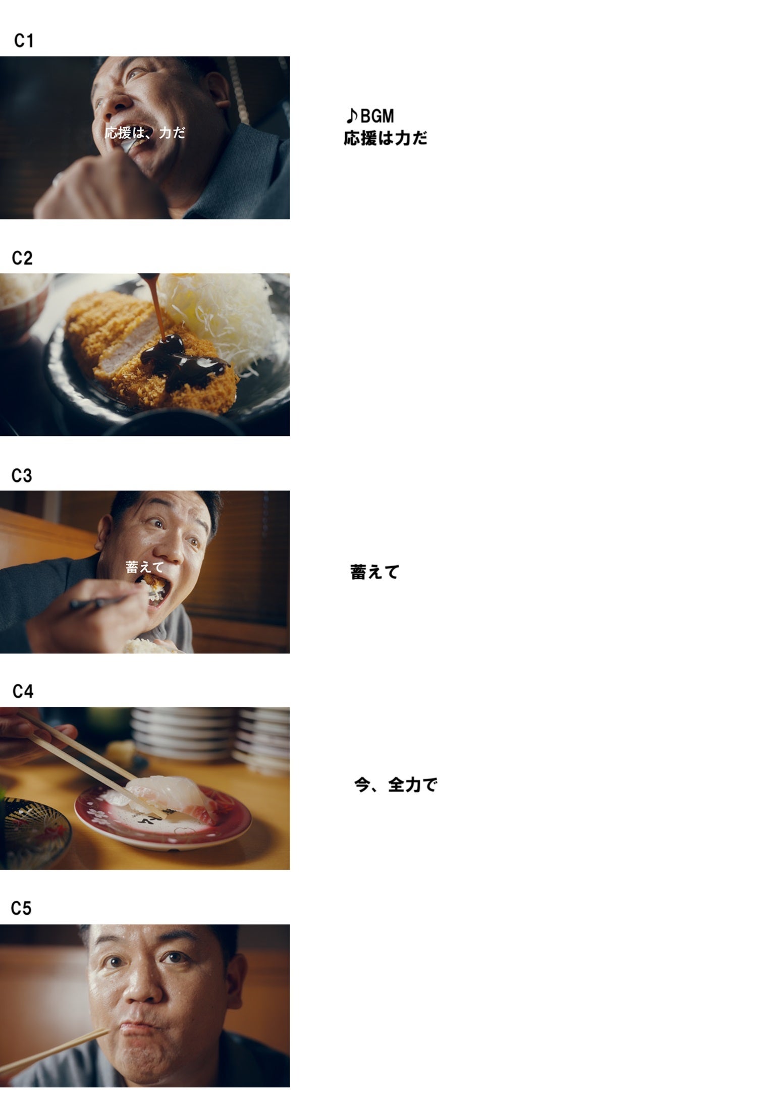 ブローウィンズ応援編では、最高の声援を送るためにお寿司やステーキ、とんかつを食べて力をつけ、試合が終わったらお寿司を食べて勝利の喜びを仲間と分かち合う、そんなBWZRSの日常を表現いたしました。