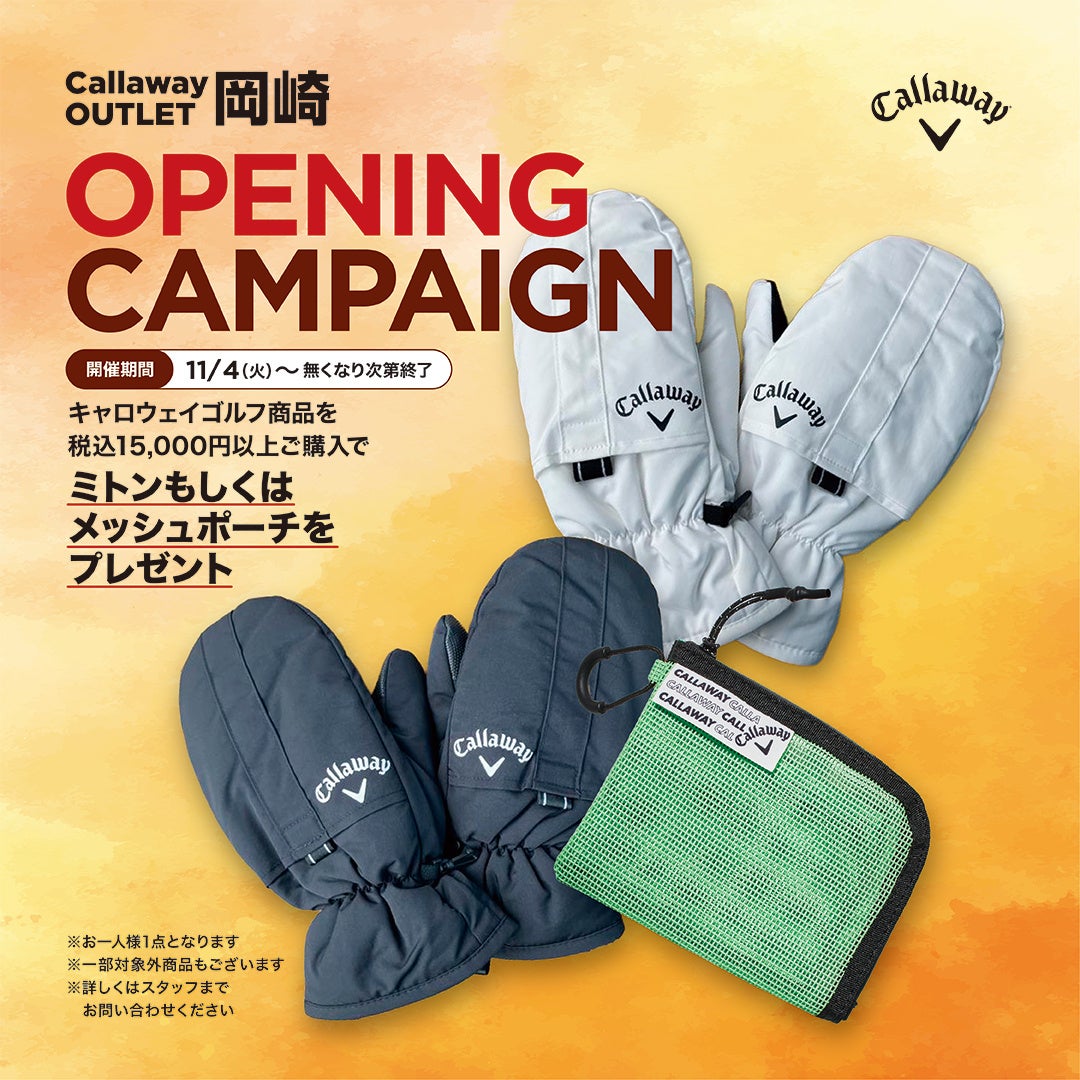 また、オープンを記念し「オープニングキャンペーン」も開催。キャロウェイゴルフ商品を税込15,000円以上ご購入で、ミトンまたはメッシュポーチのノベルティをプレゼント。