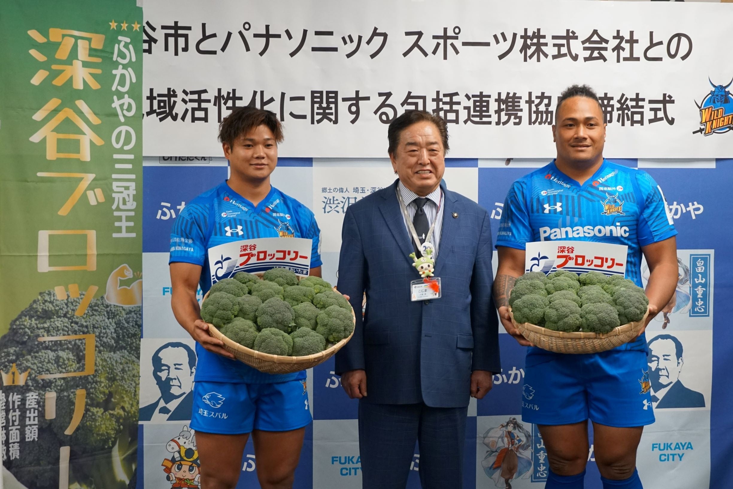 また、深谷市で行われた協定締結式では、ワイルドナイツへ作付面積日本一を誇る※2 本市の特産物で筋肉づくりに効果的ともいわれる「深谷ブロッコリー」500株を贈呈し、選手の身体づくりをサポートするとともに、リーグ制覇へ向けた激励を行いました。