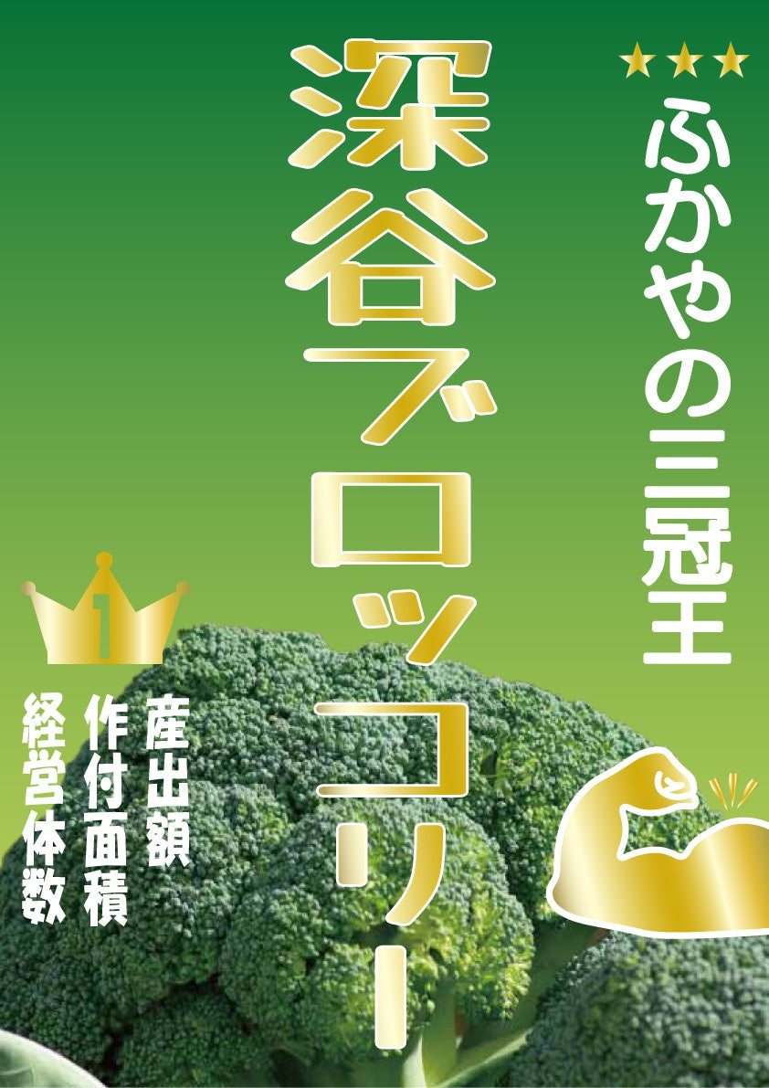 深谷市は、ブロッコリーの「作付面積」と「産出額」及び、「経営体数」で日本一を誇っています。※3 特に市内の岡部地区では、盛んに栽培がされており、秋から春にかけて収穫されます。厳しい寒さに耐えた深谷産のブロッコリーは甘みが強く、みずみずしさと茎まで食べられる柔らかさが特徴です。 深谷といえばすでに「ねぎ」が有名ですが、これからはブロッコリーにもさらに力を入れて、『農業王国ふかや』を盛り上げていきます。 皆さんにも深谷市自慢の『深谷ブロッコリー』を、ぜひ味わっていただきたいと思います。