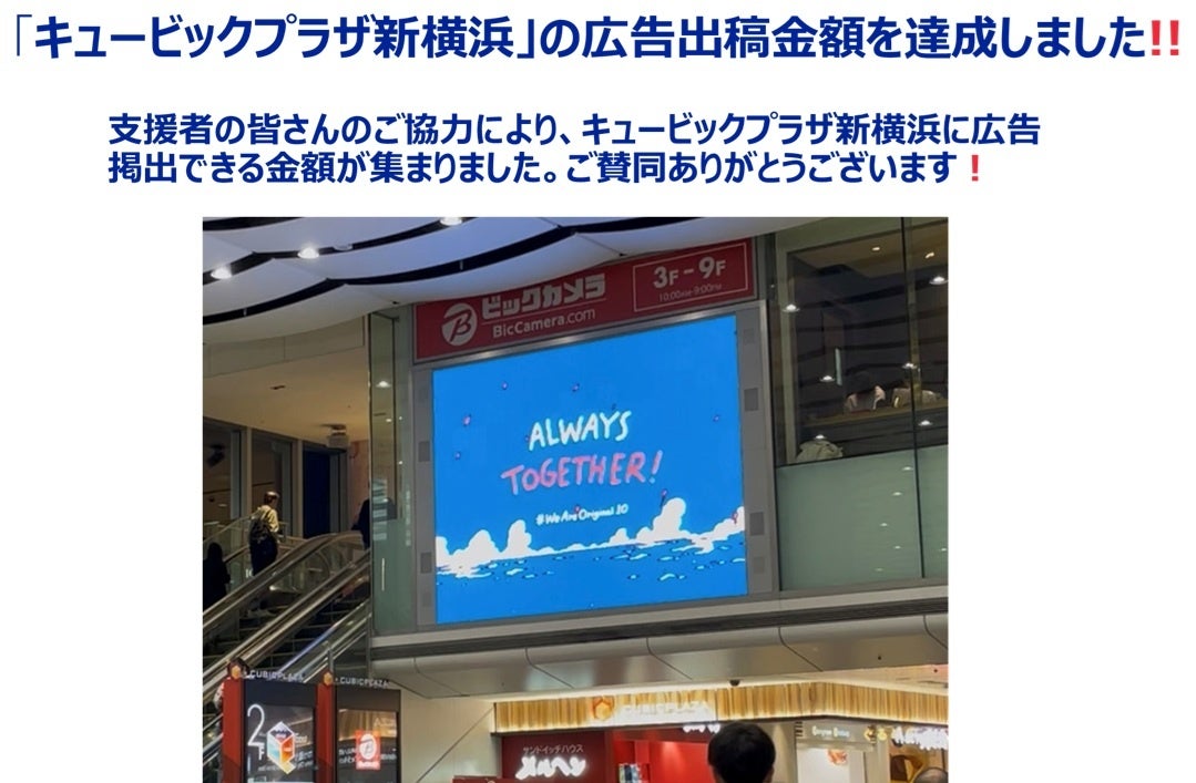 今回のプロジェクトで集まった支援金は、クラブのホームタウンである新横浜駅の駅ビル・キュービックプラザ新横浜の大型ビジョン(新横浜駅2階)に流す動画広告の製作費・掲出費に活用されました。