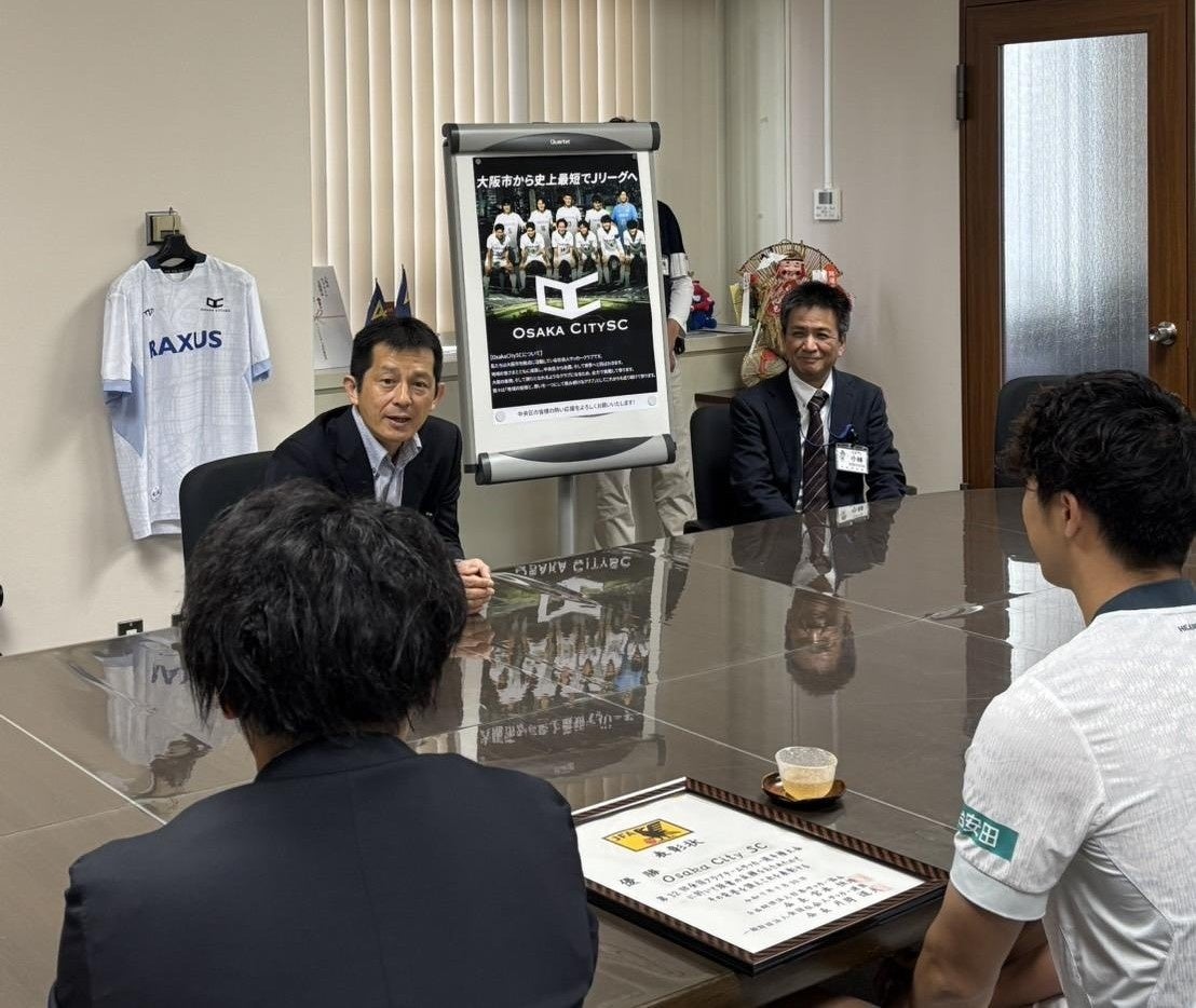 このたびOsaka City SCは、全国クラブチームサッカー選手権大会での優勝報告のため、大阪市中央区役所を訪問し、松田彰久区長に優勝のご報告を行いました。