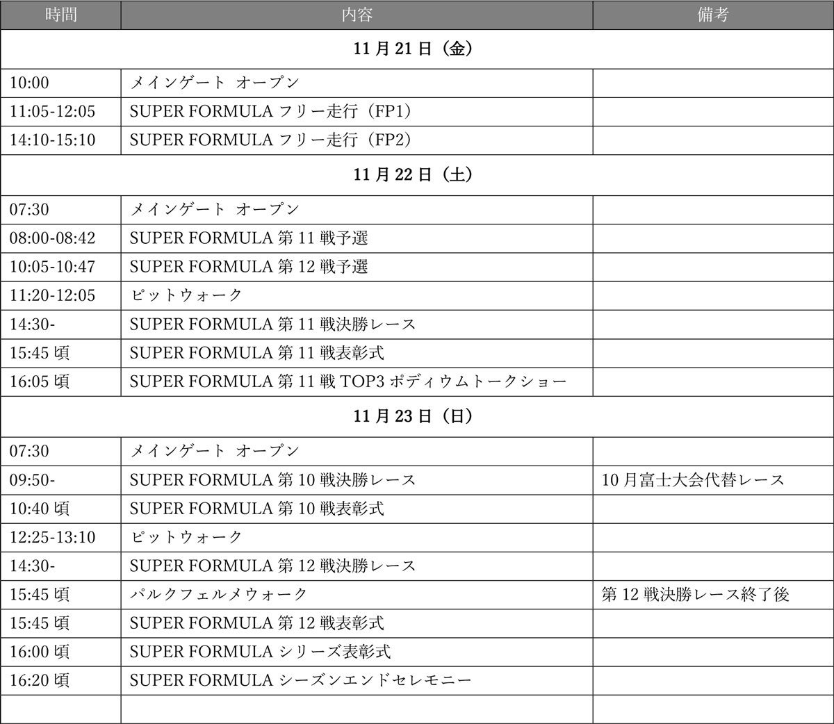 ※詳しくは⼤会HP(タイムスケジュール) https://www.suzukacircuit.jp/superformula/2/schedule/ へ