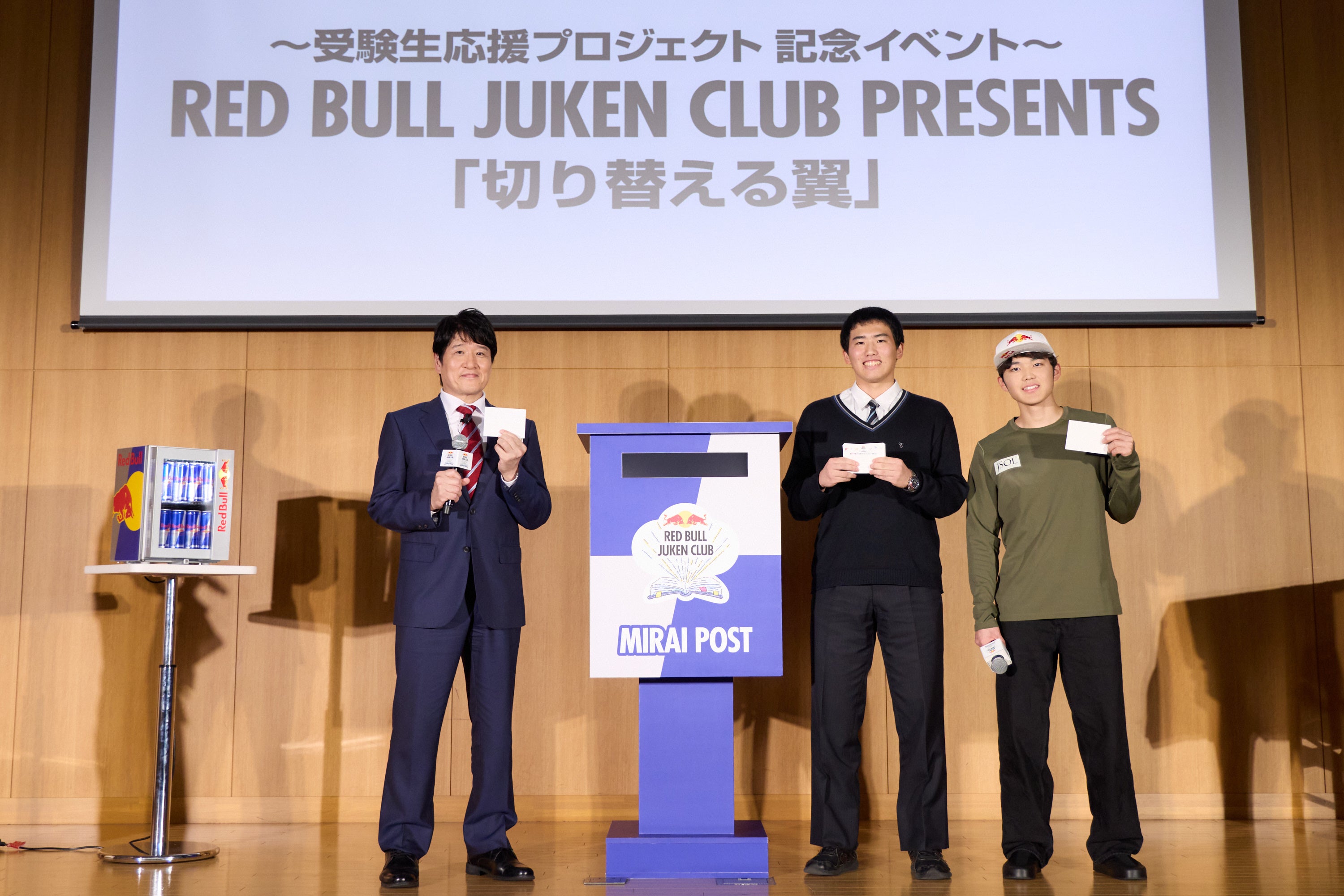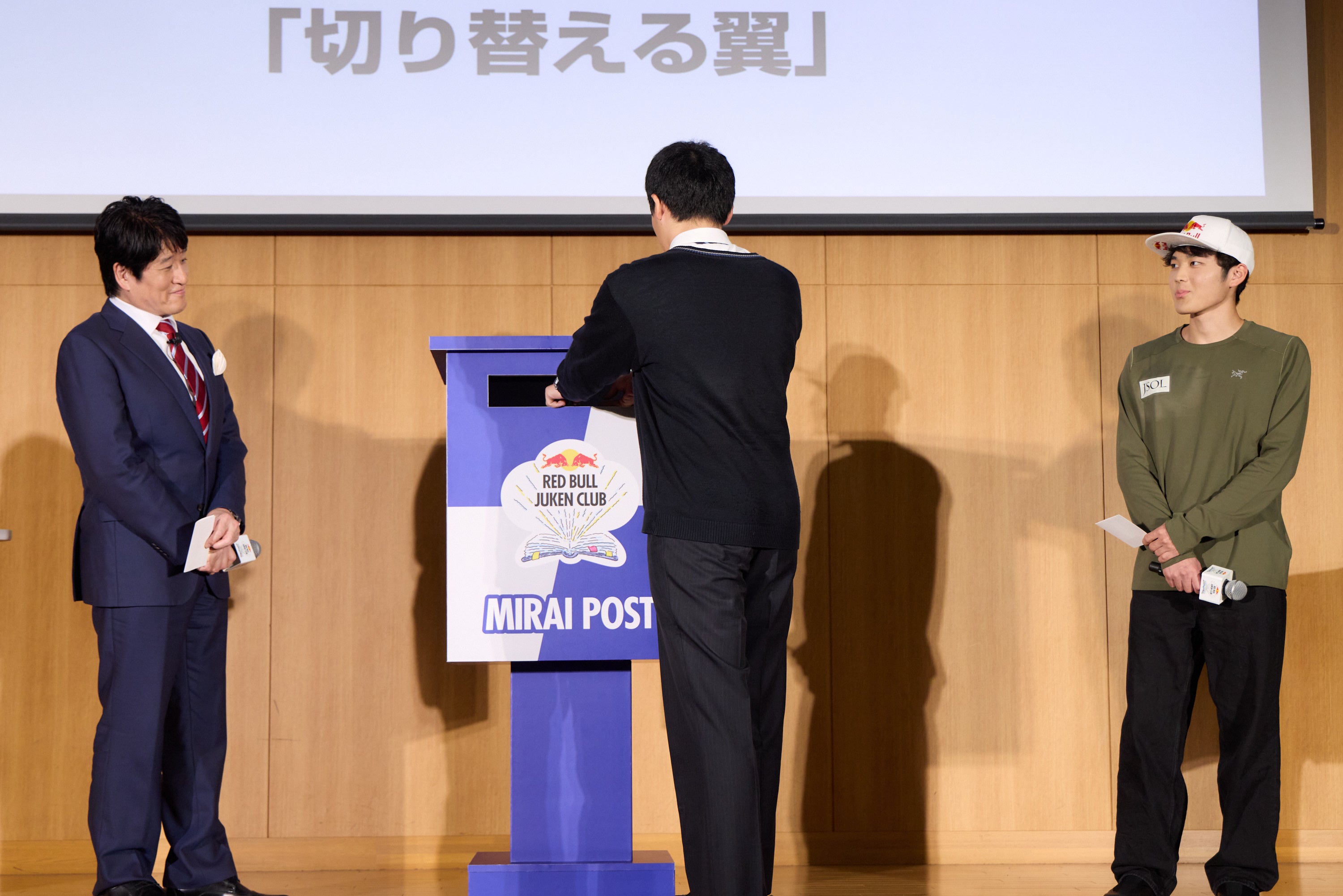 参加いただいた等々力高等学校の学生は、受験後の自分へのメッセージを書いていただきました。そして、林修先生と安楽宙斗からも受験後の学生たちに向けたメッセージを書き、学生と共に、受験後にレッドブルよりメッセージが届く「ミライポスト」へと投函しました。