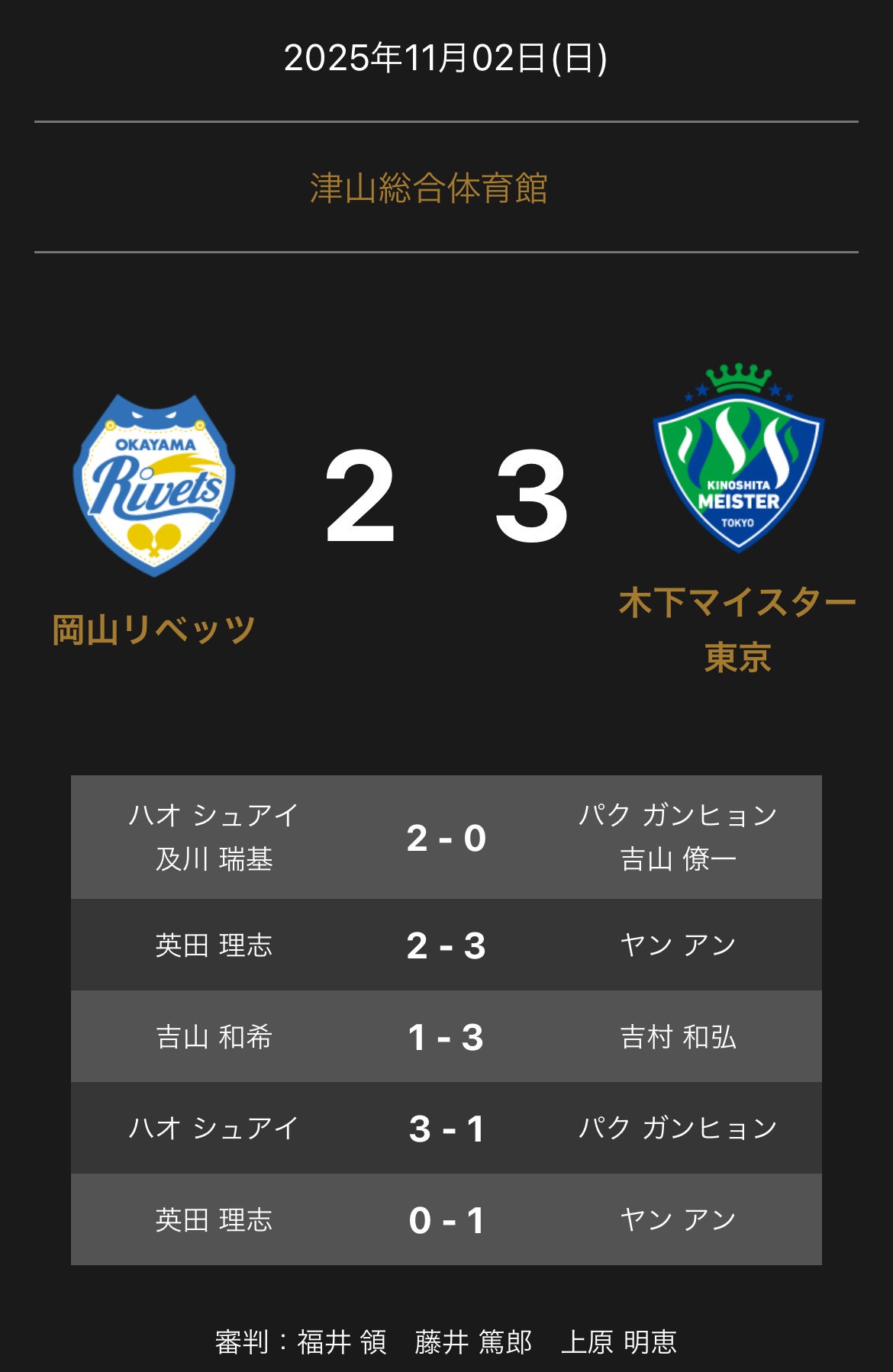 ホームプレスリリース ノジマTリーグ 2025-2026シーズン 公式戦 11月2日開催 岡山リベッツ vs 木下マイスター東京 試合結果 2025年11月02日 16時50分 公開|スポーツマニア編集部プレスリリース ノジマTリーグ 2025-2026シーズン 公式戦 11月2日開催 岡山リベッツ vs 木下マイスター東京 の試合は2-3で 木下マイスター東京が勝利しました。 一般社団法人Tリーグのプレスリリース ★結果はこちら → https://tleague.jp/schedule/detail.php?id=1192