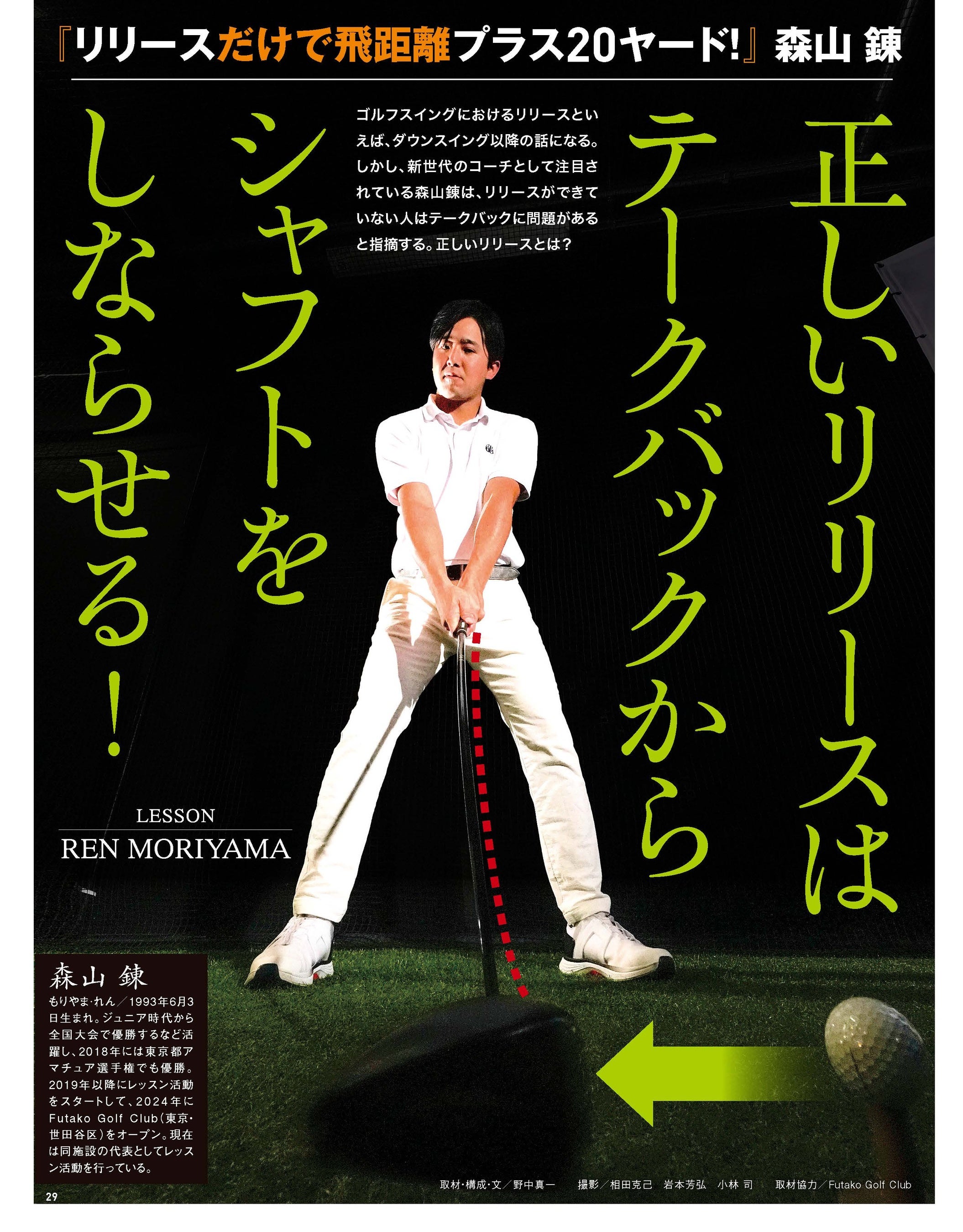 第二特集は「リリース」研究。230ヤードの壁が越えられない“飛ばない人はできていない”——飛距離アップのカギはリリースにあります。正しい動作を森山錬が実践的に解説。