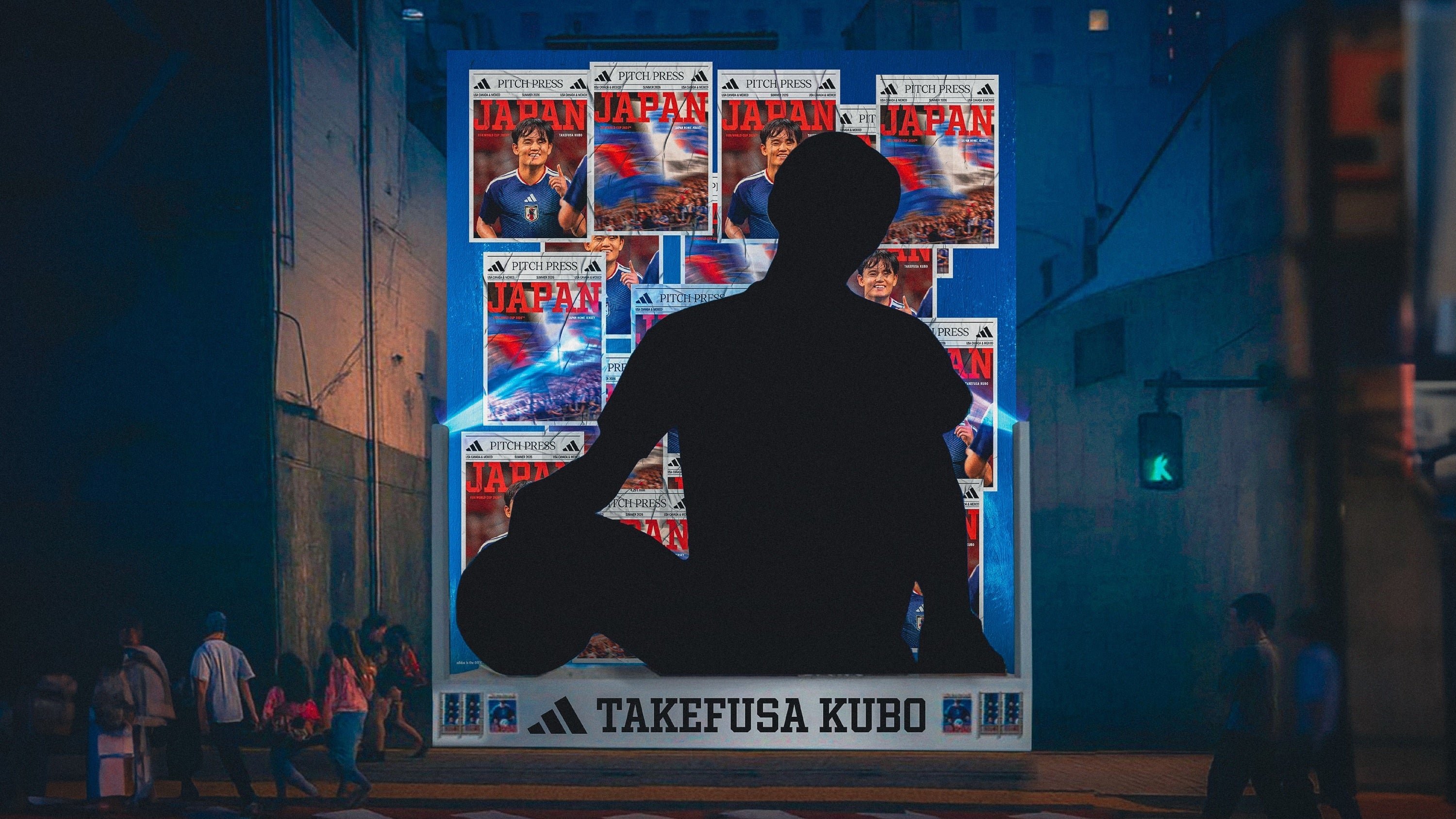11月より、全国3都市で新ユニフォームを纏ったサッカー日本代表選手たちが登場する屋外広告を順次展開します。東京では、世界で最も人が集まる交差点のひとつである渋谷スクランブル交差点に、久保 建英選手を中心とした選手たちが登場。新ユニフォームの世界観を体感できる15秒間のイマーシブ映像が、渋谷の街を包み込みます(11月7日(金)〜11月20日(木))。