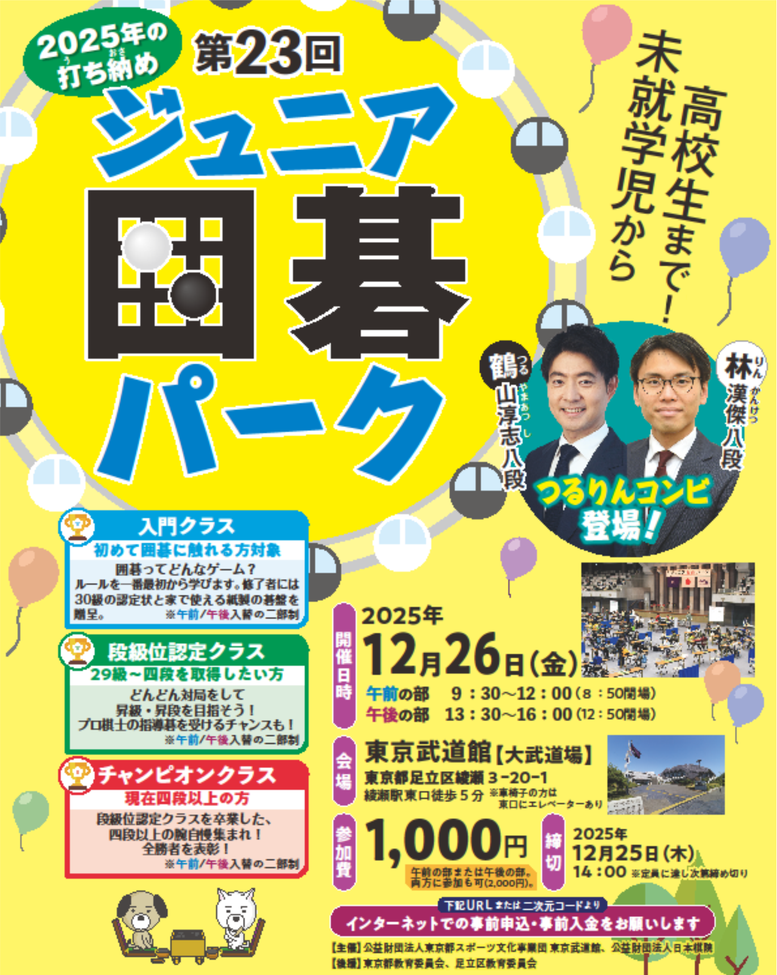 〒102-0076 東京都千代田区五番町7-2 日本棋院事業部ジュニア囲碁パーク係