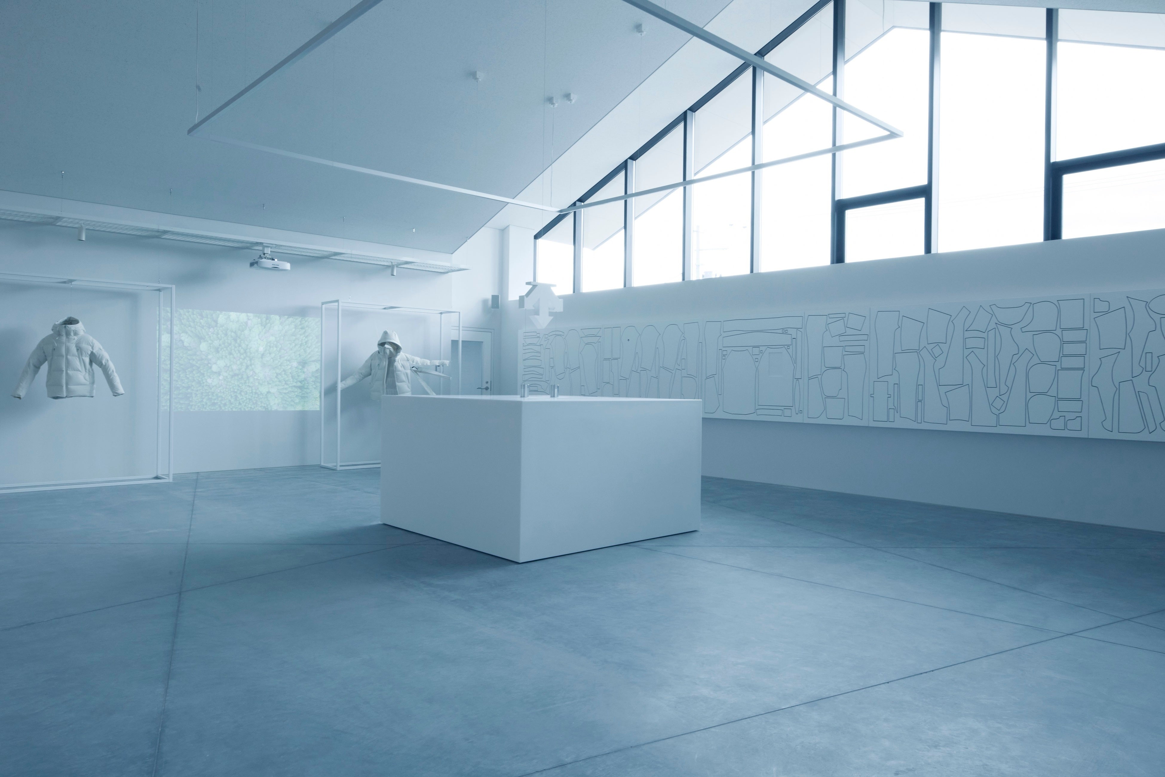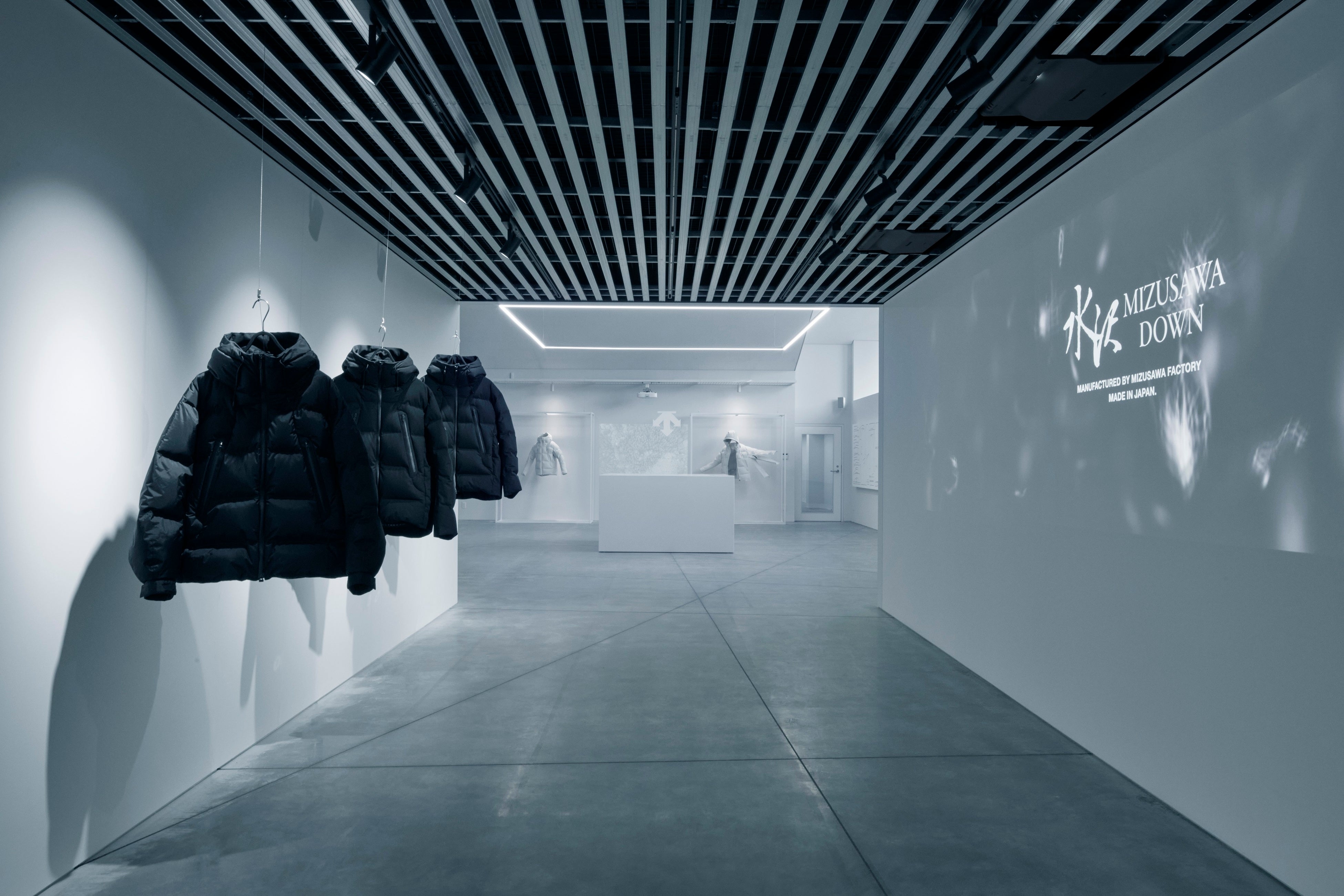 水沢ダウンと、水沢ダウンを構成する163もの裁断パーツを表現したパターンボードを展示し、『デサント』ブランドならではの繊細で難易度の高いモノづくりの世界観を表現しています。