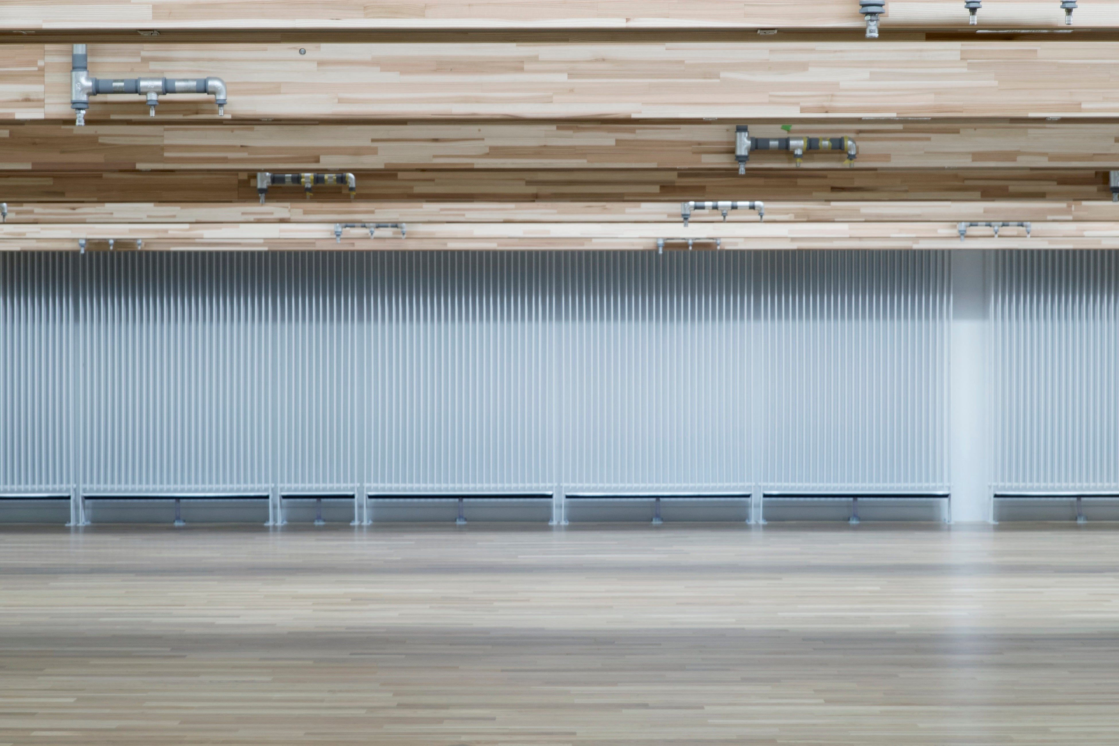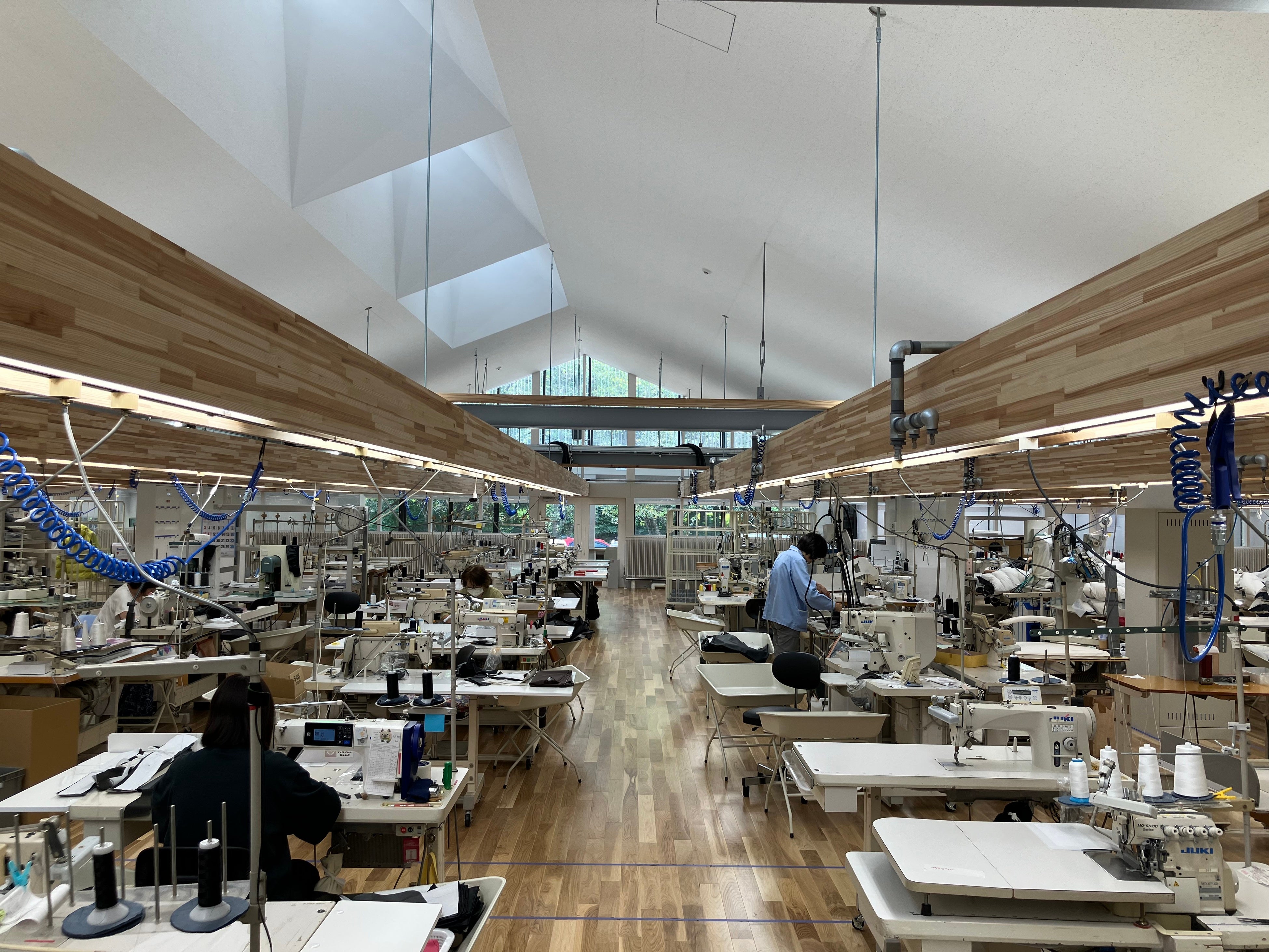 高い天井と明るい光、木のぬくもりにあふれた心地のよい空間が広がっています。床は一面フラットでラインごとに十分なスペースを確保し、導線にも徹底的にこだわったことで、働きやすく、人やモノの動きの無駄をなくしました。また、梁に配線ルートを作り、電源をどこからでもとりやすくしたことで、ミシンや機材を置く位置が限定されず製造する製品ごとにレイアウトが自由に組み替え出来るため、効率化につながっています。スタッフの大部分を占める女性でも届きやすいよう梁の高さも工夫しています。