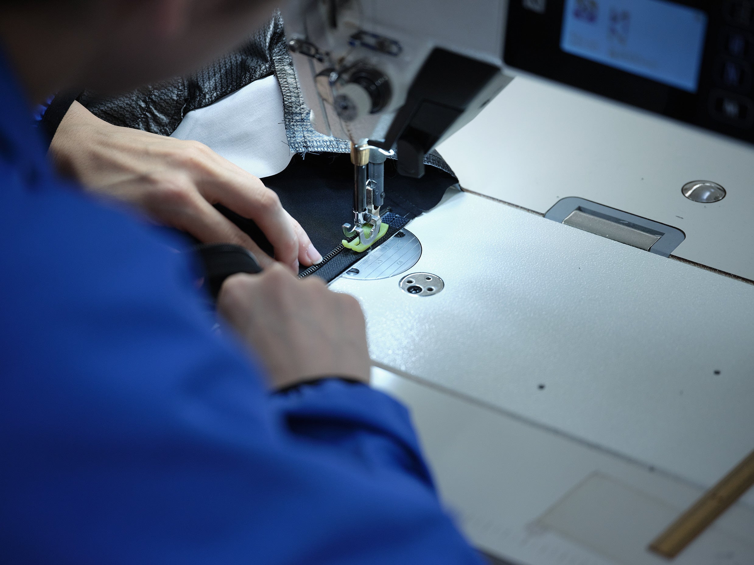 1970年に操業を開始して以来、半世紀にわたって野球のユニフォームやスキーウェア、JRA(日本中央競馬会)の騎手用防護ベストなど、機能性が高く複雑な構造の商品を生産してきました。なかでも『デサント』の代表的なアイテムであるスキーウェアは、厳しい環境下に適応するため様々な機能性が求められ、パーツ(部品)数や複雑な仕様が多く、生産が難しい商品の代表格と言えます。これら多様な高機能商品を作り上げることのできる設備をもち、高度な縫製技術を伝承し続けてきたことと、独創的なアイデアによって『デサント』が世界に誇る「水沢ダウン」は誕生しました。現在は、専用工場として年間を通じて「水沢ダウン」の生産を行うほか、工場独自のアトリエ(工房)も備え、アイデアを実際の商品に具現化するために、パターン(型紙)の設計やサンプル作製も行っています。