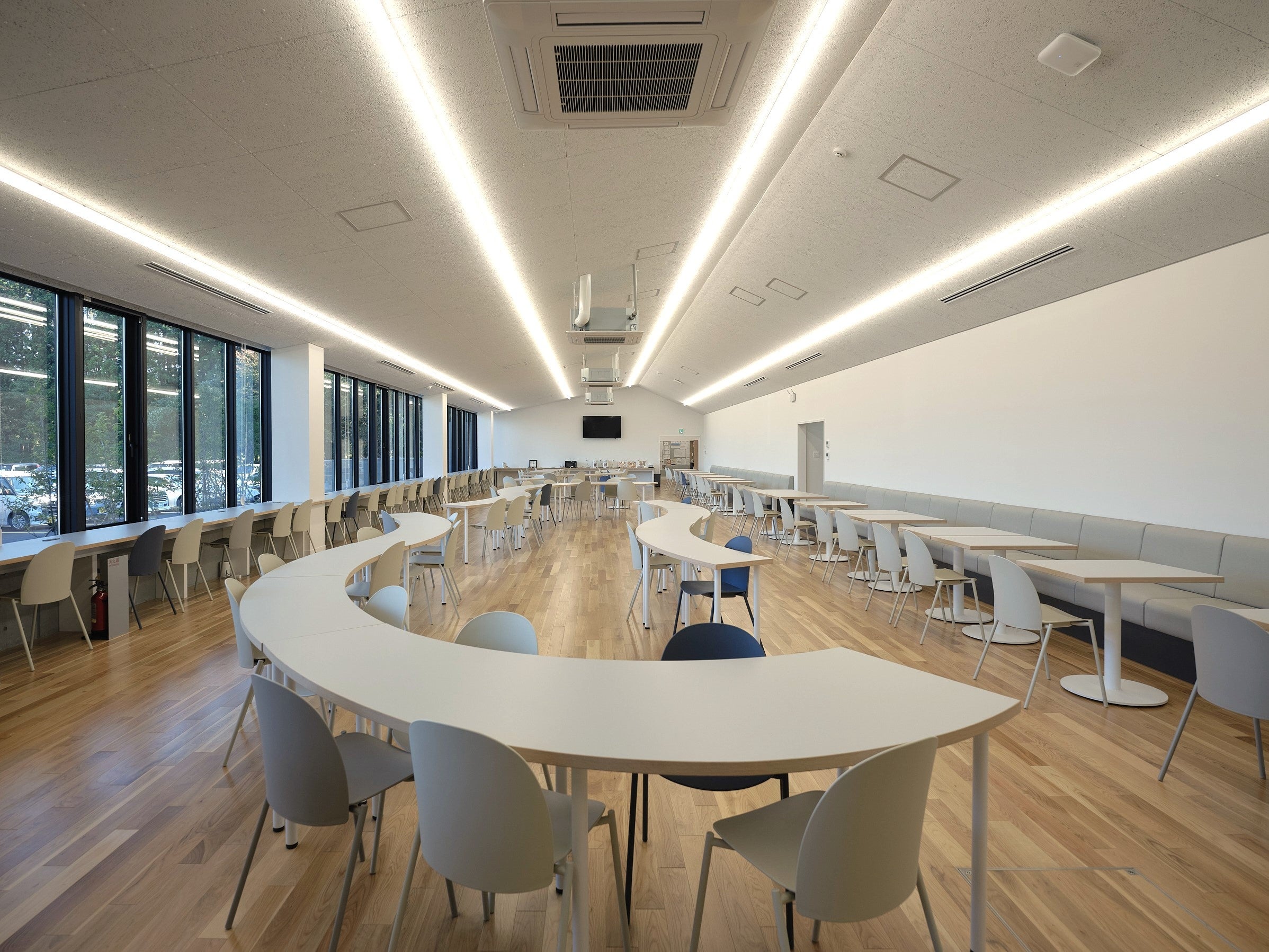 食堂や休憩室には従業員が一人ひとりにあった方法でしっかり休憩できるよう、グループで歓談できる席や一人の時間を過ごせる席、靴を脱いでくつろげるシートなど、さまざまなスペースを設けました。また、女性用の化粧室を大幅に増やし、広々としたロッカールームや服についた糸くずやダウンを取り除くためのエアシャワー室の設置など、従業員の快適性・働きやすさを追求しています。
