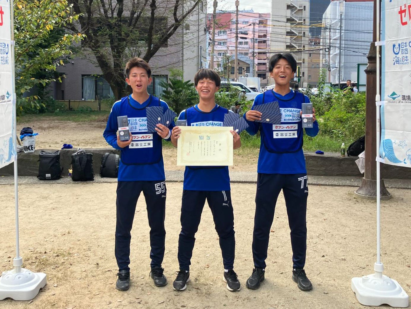 全22チームが参加した熊本県大会。MCから檄(げき)を飛ばされ開会式前から奮い立つ選手たちのやる気みなぎる様子が激戦を予感させるなか、見事優勝を勝ち取ったのは、大津高校「Blue Sweepers(ブルースウィーパーズ)」チームでした。作戦タイムで綿密なごみ拾いプランを組み立て、サッカー部ならではのチームプレイで序盤から圧倒的なリードを奪いました。軽量なのにポイントが高いたばこの吸い殻と、重量に貢献するビン・缶を効率よく集め、ごみ総量10.06kg/2,247.5ポイントを獲得し、準優勝チームに500ポイント近く差をつけての優勝となりました。