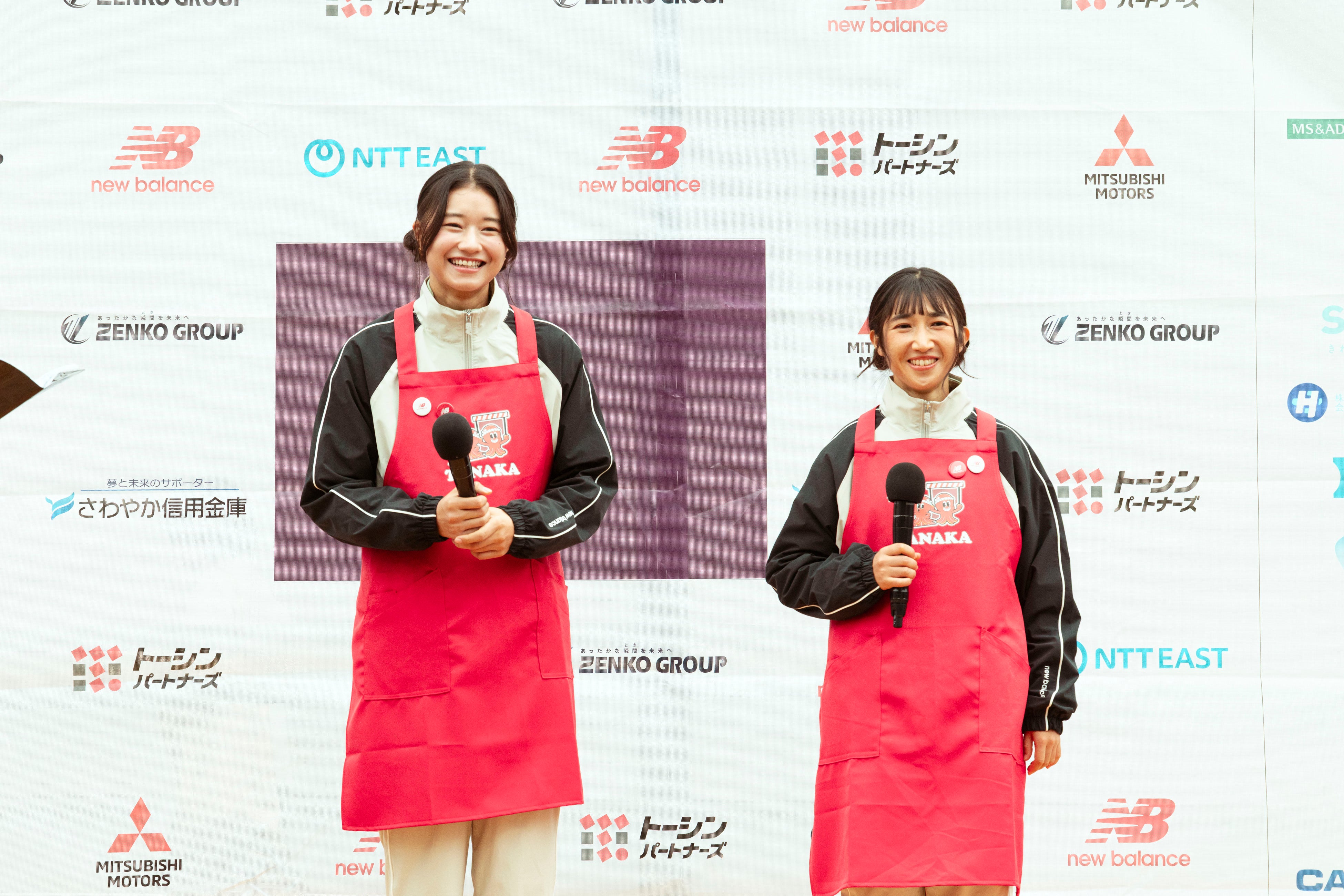 そしてニューバランスブースでは「たこ焼き田中」をオープン。両選手は「日ごろ皆様からの応援に励まされています。そんな感謝の気持ちをお返ししたいという想いからgives backの活動を行っています。これまでgives backの活動はランナーの皆さんへのプレゼントや、ランナーの方と一緒に走ってコミュニケーションを取る、という形で参加していましたが、もっと、心で繋がれるようなことをしたい、と話し合った結果、学園祭のようなほのぼのした雰囲気で皆さんと触れ合えればと思いました。2人とも関西出身ということでたこ焼きに決定し、2人とも田中なので“たこ焼き田中”という名前にしました。」とコメントし、日頃の選手活動への応援への感謝として、大会に参加したキッズ・ジュニアランナーの皆さんへたこ焼きをふるまいました。