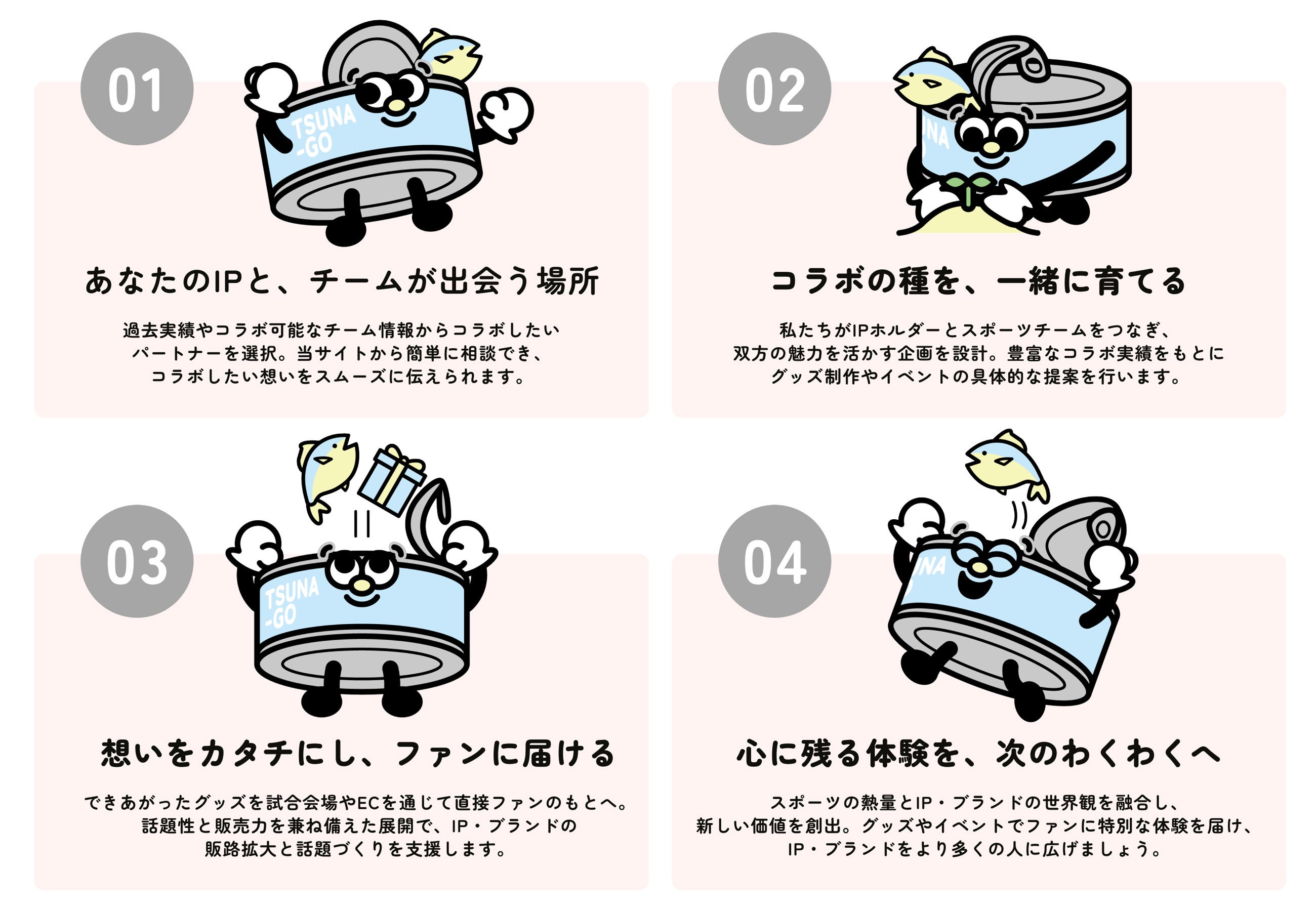 そのノウハウを生かし、新サービス「TSUNA-GO(ツナゴー)」では、タッチポイントとなるサービスサイトをつくることで、コラボ企画を希望するIP・ブランド・クリエイターとスポーツチームが出会い、新しいワクワクを創出する場所を提供します。