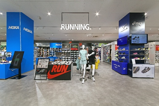 定番のナイキから、話題のオン、ホカまで、人気ブランドのシューズが豊富なカラーバリエーションで勢揃い。アシックス、アディダス、ニューバランスなど実績あるブランドも充実。オンやザ・ノース・フェイスなどの希少ブランドを含むウェア、インソール、ソックス、バッグ類まで、トータルコーディネートが可能です。また、日本シグマックス(株)製の最新「3D 足形測定器」で足の形状を細かくチェックし、専任スタッフが最適な一足をご提案。IMBOXによる「撥水」「防汚」「紫外線による色あせを防ぐ」シューズコーティングサービスもご提供。ランニングコーナーの一部床材には新国立競技場と同じ素材を使用し、売場、サービス、商品全てにおいてパワーアップいたしました。