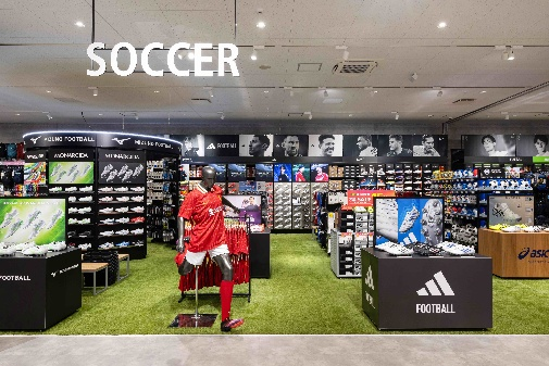 全面に人工芝を敷き詰め、オンピッチを彷彿させる「リアル体験型」の売り場で実際に商品をお試しいただけます。初心者から上級者まで満足いただける豊富なシューズラインナップを揃え、ジュニアシューズは16㎝からご用意。お子様にぴったりのスパイク選びをサポートします。特にミズノは特設売場を展開し、圧倒的な商品量を楽しめる空間となっています。ウェアはアスレタ、プーマ、ナイキ、アンブロなどの人気ブランドを中心に、部活生やジュニア向けに幅広い品揃えを展開。 また、タビオの機能ソックスをはじめ、充実したアイテム構成で快適なサッカーライフを応援します。